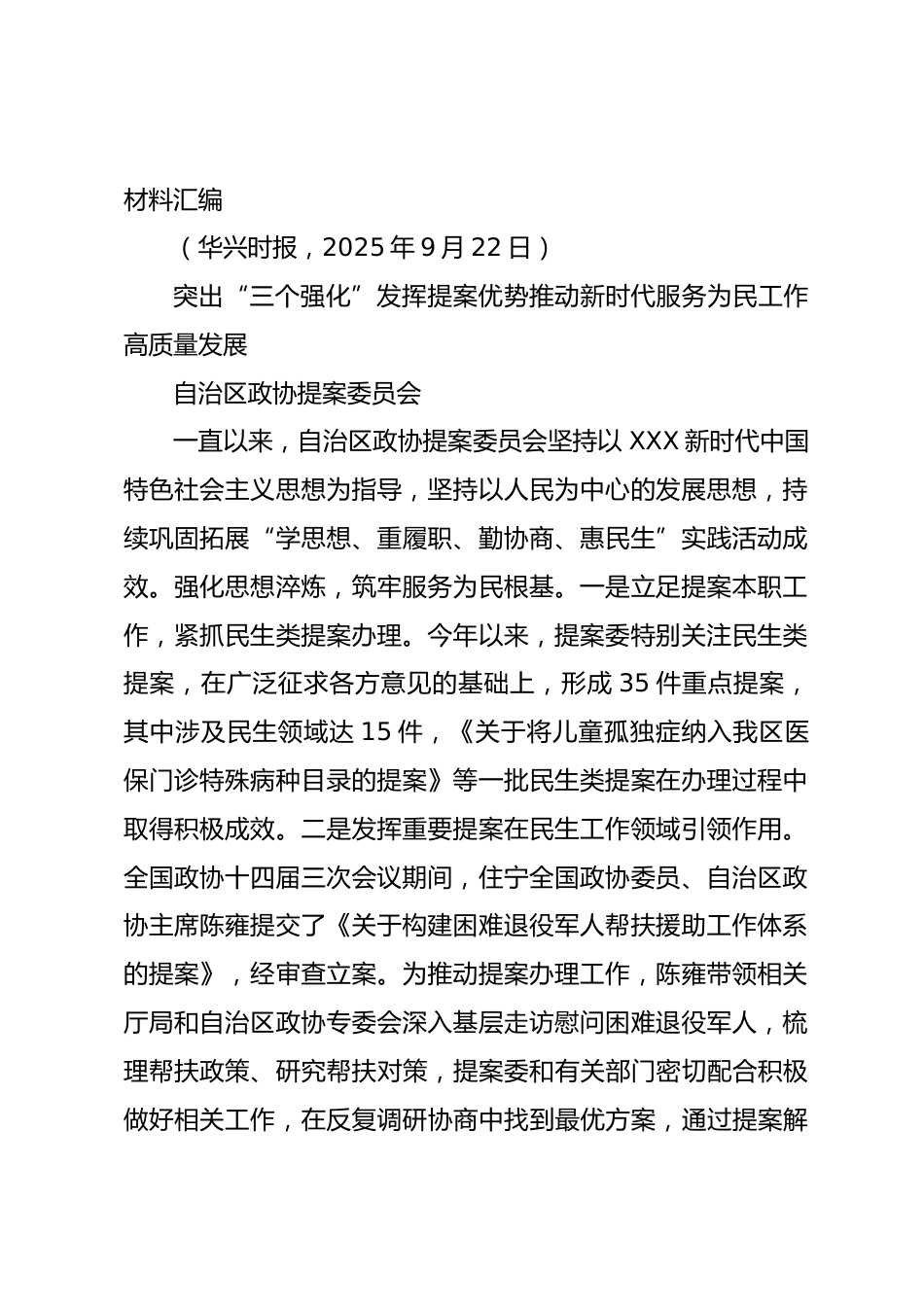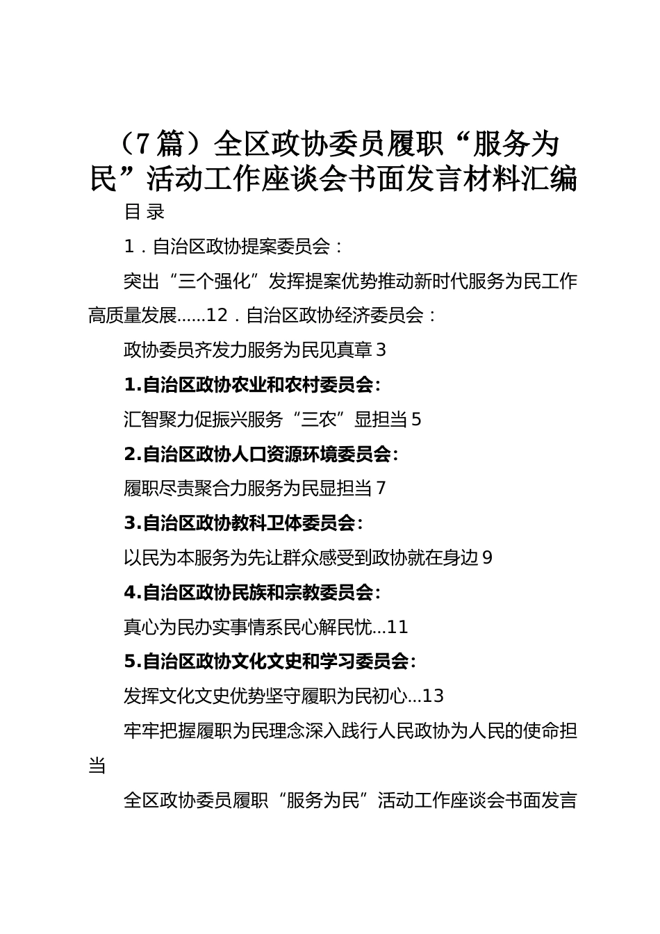 (7篇)全區(qū)政協(xié)委員履職“服務(wù)為民”活動(dòng)工作座談會(huì)書面發(fā)言材料匯編目錄1.自治區(qū)政協(xié)提案委員會(huì):突出“三個(gè)強(qiáng)化”發(fā)揮提案優(yōu)勢(shì)推動(dòng)新時(shí)代服務(wù)為民工作高質(zhì)量發(fā)展……12.自治區(qū)政協(xié)經(jīng)濟(jì)委員會(huì):政協(xié)委員齊發(fā)力服務(wù)為民見真章31.自治區(qū)政協(xié)農(nóng)業(yè)和農(nóng)村委員會(huì):匯智聚力促振興服務(wù)“三農(nóng)”顯擔(dān)當(dāng)52.自治區(qū)政協(xié)人口資源環(huán)境委員會(huì):履職盡責(zé)聚合力服務(wù)為民顯擔(dān)當(dāng)73.自治區(qū)政協(xié)教科衛(wèi)體委員會(huì):以民為本服務(wù)為先讓群眾感受到政協(xié)就在身邊94.自治區(qū)政協(xié)民族和宗教委員會(huì):真心為民辦實(shí)事情系民心解民憂…115.自治區(qū)政協(xié)文化文史和學(xué)習(xí)委員會(huì):發(fā)揮文化文史優(yōu)勢(shì)堅(jiān)守履職為民...