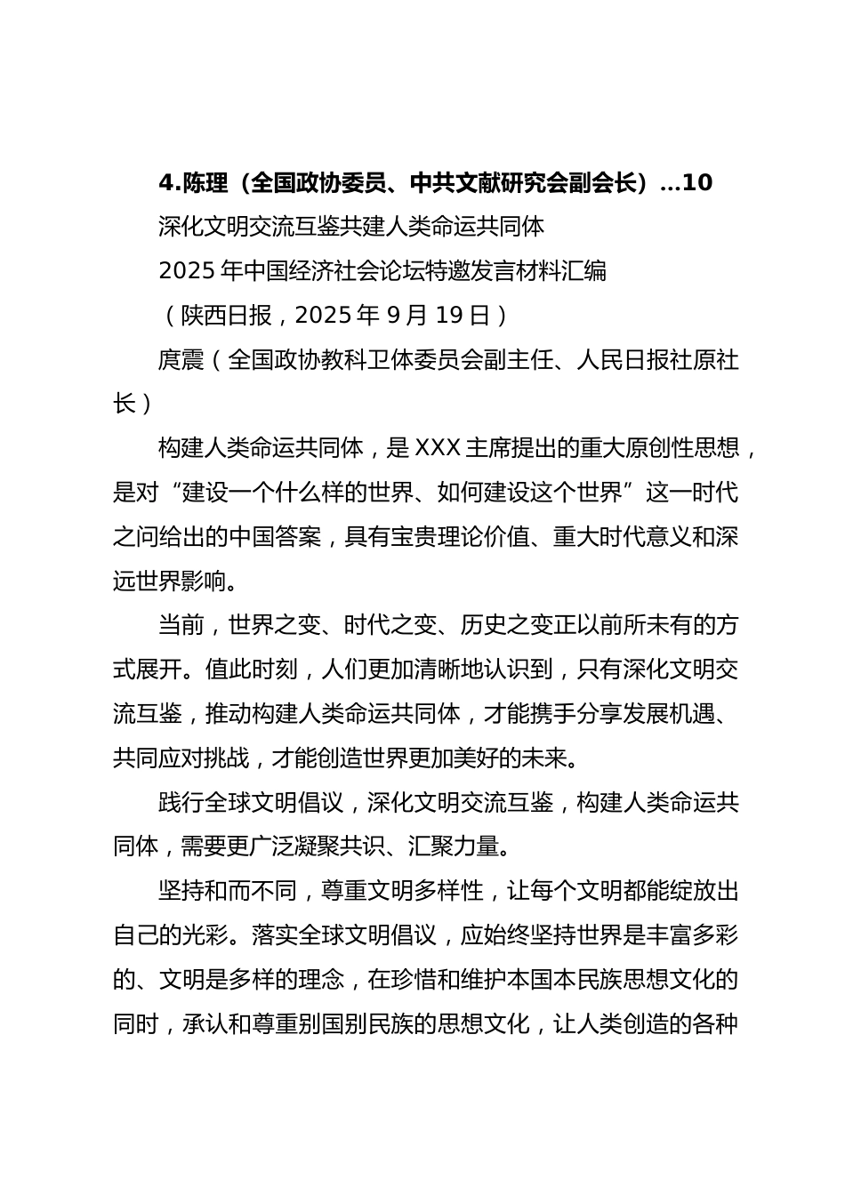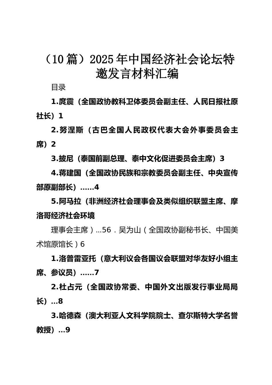 (10篇)2025年中國經(jīng)濟(jì)社會論壇特邀發(fā)言材料匯編目錄1.庹震(全國政協(xié)教科衛(wèi)體委員會副主任、人民日報社原社長)12.努涅斯(古巴全國人民政權(quán)代表大會外事委員會主席)23.披尼(泰國前副總理、泰中文化促進(jìn)委員會主席)34.蔣建國(全國政協(xié)民族和宗教委員會副主任、中央宣傳部原副部長)……45.阿馬拉(非洲經(jīng)濟(jì)社會理事會及類似組織聯(lián)盟主席、摩洛哥經(jīng)濟(jì)社會環(huán)境理事會主席)…56.吳為山(全國政協(xié)副秘書長、中國美術(shù)館原館長)61.洛普雷亞托(意大利議會各國議會聯(lián)盟對華友好小組主席、參議員)……72.杜占元(全國政協(xié)常委、中國外文出版發(fā)行事業(yè)局局長)…83.哈德...