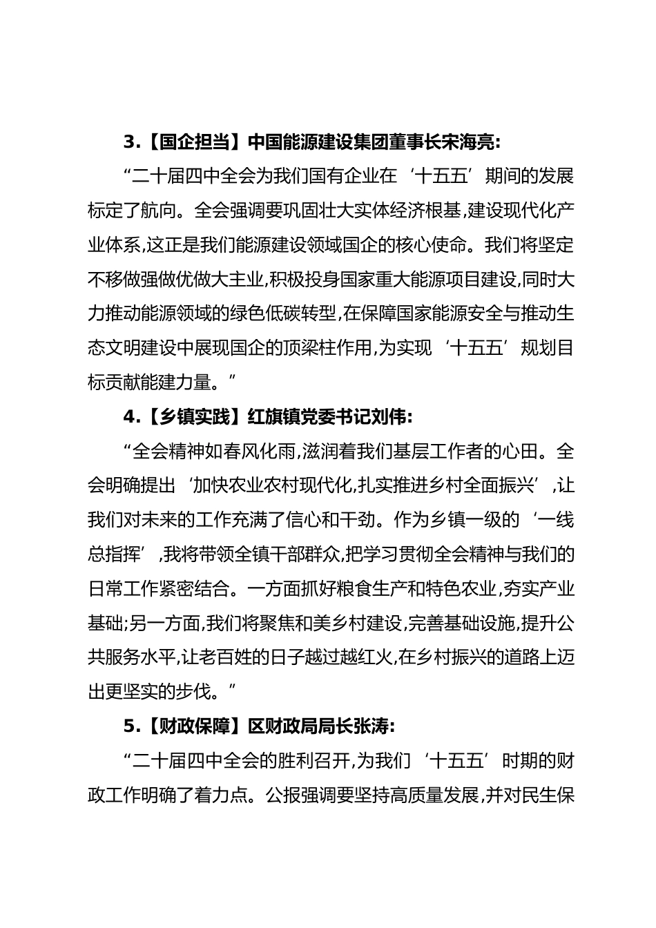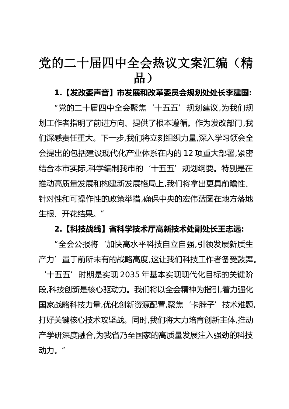 黨的二十屆四中全會(huì)熱議文案匯編(精品)1.【發(fā)改委聲音】市發(fā)展和改革委員會(huì)規(guī)劃處處長李建國:“黨的二十屆四中全會(huì)聚焦‘十五五’規(guī)劃建議,為我們規(guī)劃工作者指明了前進(jìn)方向、提供了根本遵循。作為發(fā)改部門,我們深感責(zé)任重大。下一步,我們將立刻組織力量,深入學(xué)習(xí)領(lǐng)會(huì)全會(huì)提出的包括建設(shè)現(xiàn)代化產(chǎn)業(yè)體系在內(nèi)的12項(xiàng)重大部署,緊密結(jié)合本市實(shí)際,科學(xué)編制我市的‘十五五’規(guī)劃綱要。特別是在推動(dòng)高質(zhì)量發(fā)展和構(gòu)建新發(fā)展格局上,我們將拿出更具前瞻性、針對(duì)性和可操作性的政策舉措,確保中央的宏偉藍(lán)圖在地方落地生根、開花結(jié)果。”2.【科技戰(zhàn)線】省科學(xué)技術(shù)廳高新技術(shù)處副處長...