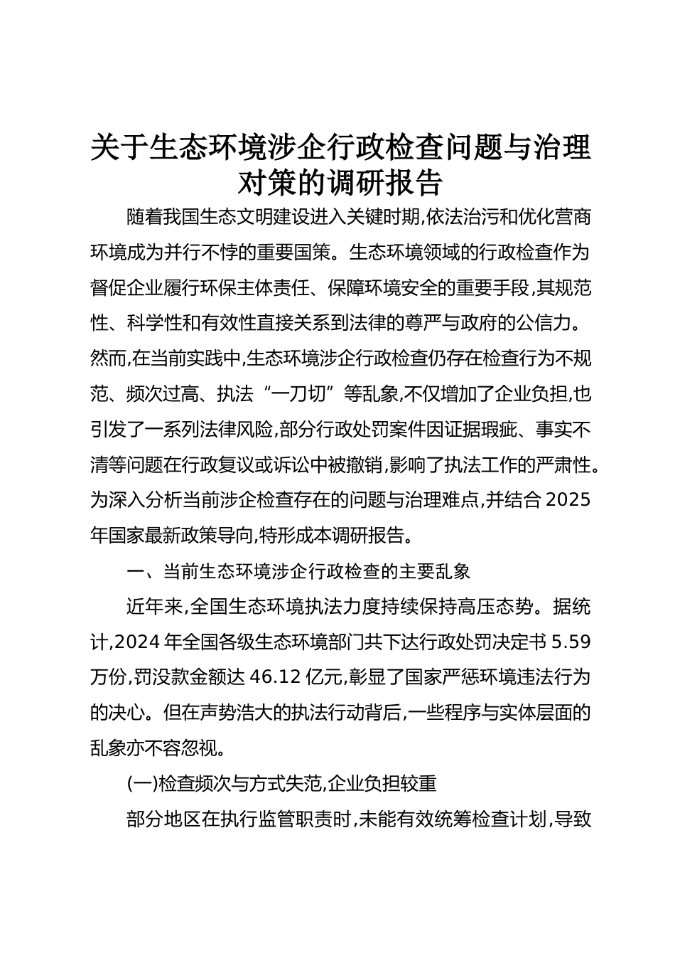 關(guān)于生態(tài)環(huán)境涉企行政檢查問題與治理對策的調(diào)研報告