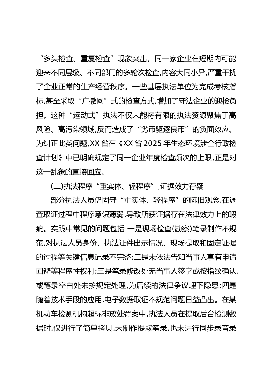 關(guān)于生態(tài)環(huán)境涉企行政檢查問題與治理對策的調(diào)研報告隨著我國生態(tài)文明建設(shè)進入關(guān)鍵時期,依法治污和優(yōu)化營商環(huán)境成為并行不悖的重要國策。生態(tài)環(huán)境領(lǐng)域的行政檢查作為督促企業(yè)履行環(huán)保主體責(zé)任、保障環(huán)境安全的重要手段,其規(guī)范性、科學(xué)性和有效性直接關(guān)系到法律的尊嚴與政府的公信力。然而,在當(dāng)前實踐中,生態(tài)環(huán)境涉企行政檢查仍存在檢查行為不規(guī)范、頻次過高、執(zhí)法“一刀切”等亂象,不僅增加了企業(yè)負擔(dān),也引發(fā)了一系列法律風(fēng)險,部分行政處罰案件因證據(jù)瑕疵、事實不清等問題在行政復(fù)議或訴訟中被撤銷,影響了執(zhí)法工作的嚴肅性。為深入分析當(dāng)前涉企檢查存在的問題與治理難點,...