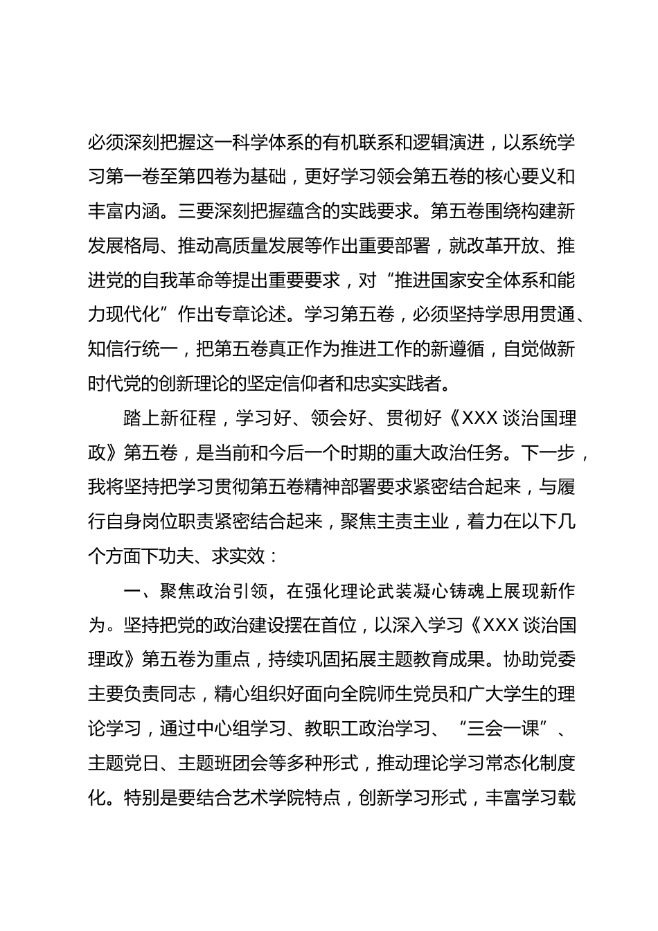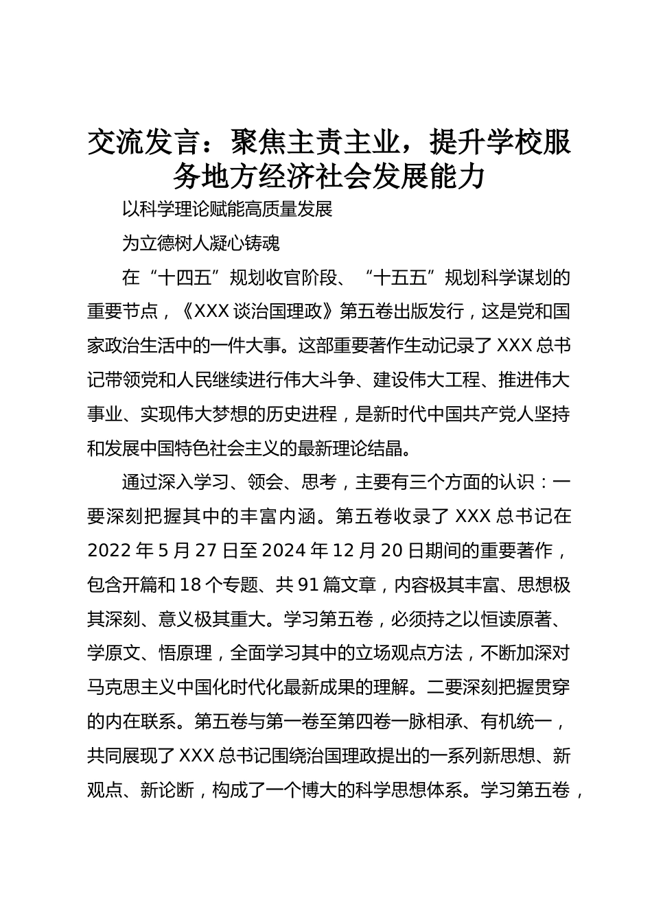 交流發(fā)言:聚焦主責(zé)主業(yè),提升學(xué)校服務(wù)地方經(jīng)濟(jì)社會(huì)發(fā)展能力以科學(xué)理論賦能高質(zhì)量發(fā)展為立德樹(shù)人凝心鑄魂在“十四五”規(guī)劃收官階段、“十五五”規(guī)劃科學(xué)謀劃的重要節(jié)點(diǎn),《XXX談治國(guó)理政》第五卷出版發(fā)行,這是黨和國(guó)家政治生活中的一件大事。這部重要著作生動(dòng)記錄了XXX總書(shū)記帶領(lǐng)黨和人民繼續(xù)進(jìn)行偉大斗爭(zhēng)、建設(shè)偉大工程、推進(jìn)偉大事業(yè)、實(shí)現(xiàn)偉大夢(mèng)想的歷史進(jìn)程,是新時(shí)代中國(guó)共產(chǎn)黨人堅(jiān)持和發(fā)展中國(guó)特色社會(huì)主義的最新理論結(jié)晶。通過(guò)深入學(xué)習(xí)、領(lǐng)會(huì)、思考,主要有三個(gè)方面的認(rèn)識(shí):一要深刻把握其中的豐富內(nèi)涵。第五卷收錄了XXX總書(shū)記在2022年5月27日至2024年12月20日期...