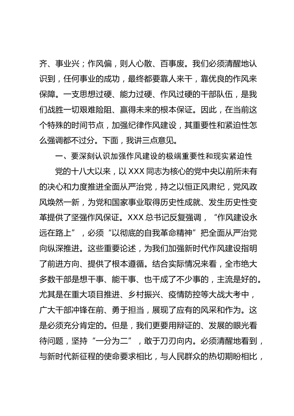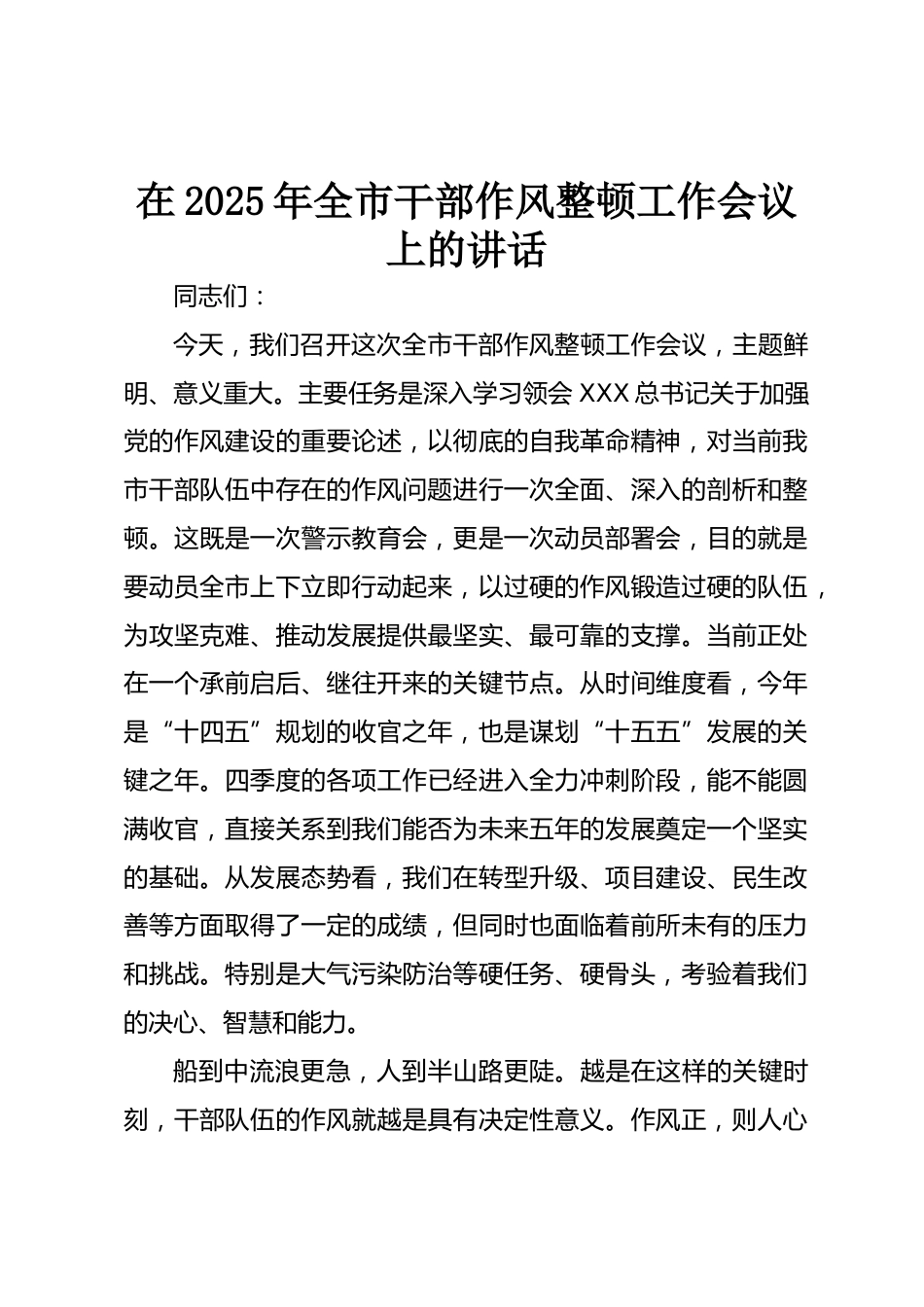 在2025年全市干部作風(fēng)整頓工作會(huì)議上的講話同志們:今天,我們召開(kāi)這次全市干部作風(fēng)整頓工作會(huì)議,主題鮮明、意義重大。主要任務(wù)是深入學(xué)習(xí)領(lǐng)會(huì)XXX總書(shū)記關(guān)于加強(qiáng)黨的作風(fēng)建設(shè)的重要論述,以徹底的自我革命精神,對(duì)當(dāng)前我市干部隊(duì)伍中存在的作風(fēng)問(wèn)題進(jìn)行一次全面、深入的剖析和整頓。這既是一次警示教育會(huì),更是一次動(dòng)員部署會(huì),目的就是要?jiǎng)訂T全市上下立即行動(dòng)起來(lái),以過(guò)硬的作風(fēng)鍛造過(guò)硬的隊(duì)伍,為攻堅(jiān)克難、推動(dòng)發(fā)展提供最堅(jiān)實(shí)、最可靠的支撐。當(dāng)前正處在一個(gè)承前啟后、繼往開(kāi)來(lái)的關(guān)鍵節(jié)點(diǎn)。從時(shí)間維度看,今年是“十四五”規(guī)劃的收官之年,也是謀劃“十五五”發(fā)展的...