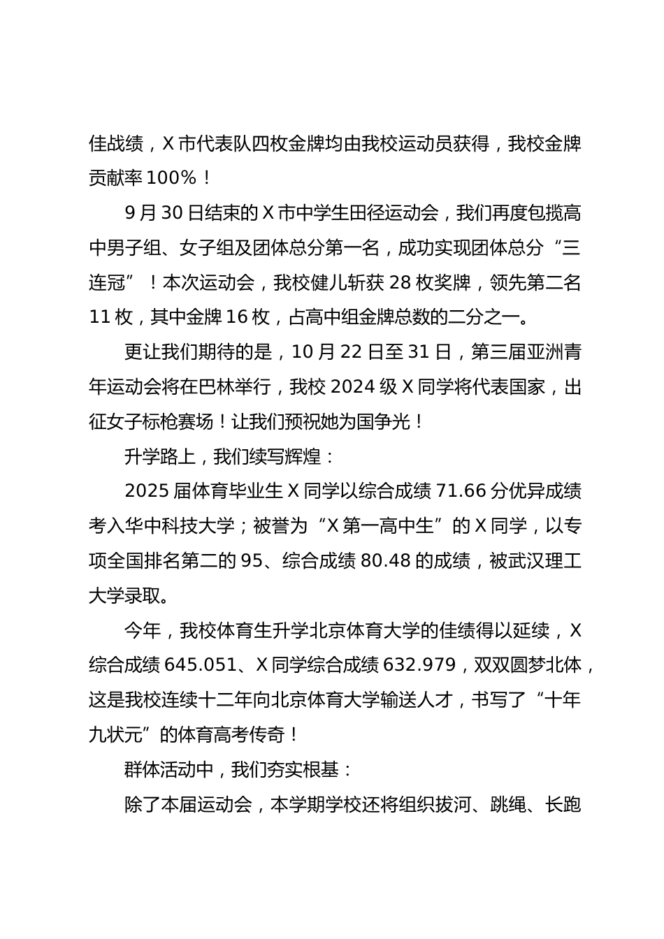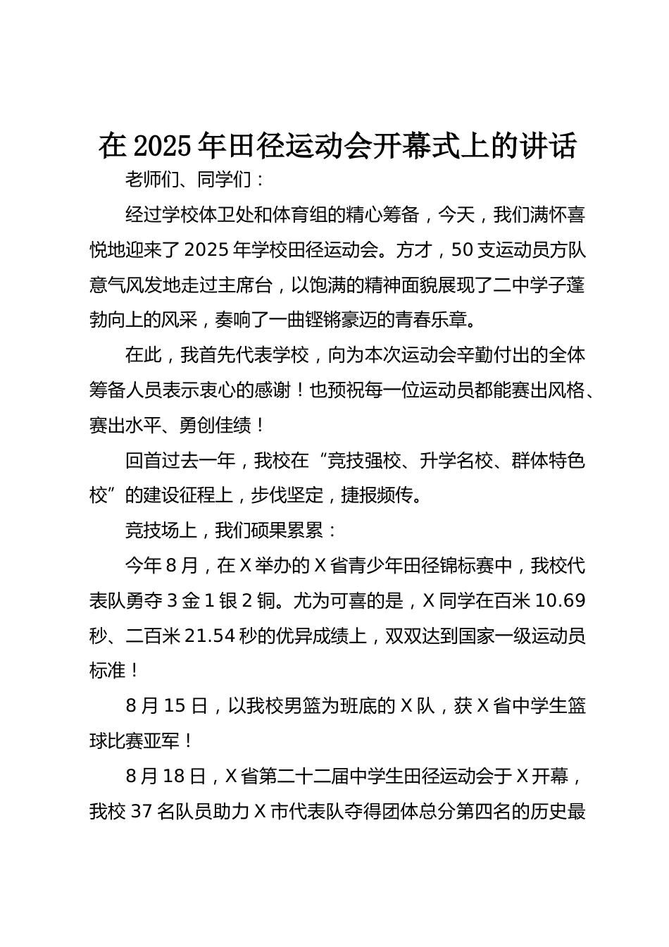 在2025年田徑運(yùn)動(dòng)會(huì)開(kāi)幕式上的講話老師們、同學(xué)們:經(jīng)過(guò)學(xué)校體衛(wèi)處和體育組的精心籌備,今天,我們滿(mǎn)懷喜悅地迎來(lái)了2025年學(xué)校田徑運(yùn)動(dòng)會(huì)。方才,50支運(yùn)動(dòng)員方隊(duì)意氣風(fēng)發(fā)地走過(guò)主席臺(tái),以飽滿(mǎn)的精神面貌展現(xiàn)了二中學(xué)子蓬勃向上的風(fēng)采,奏響了一曲鏗鏘豪邁的青春樂(lè)章。在此,我首先代表學(xué)校,向?yàn)楸敬芜\(yùn)動(dòng)會(huì)辛勤付出的全體籌備人員表示衷心的感謝!也預(yù)祝每一位運(yùn)動(dòng)員都能賽出風(fēng)格、賽出水平、勇創(chuàng)佳績(jī)!回首過(guò)去一年,我校在“競(jìng)技強(qiáng)校、升學(xué)名校、群體特色?!钡慕ㄔO(shè)征程上,步伐堅(jiān)定,捷報(bào)頻傳。競(jìng)技場(chǎng)上,我們碩果累累:今年8月,在X舉辦的X省青少年田徑錦標(biāo)賽中,我...