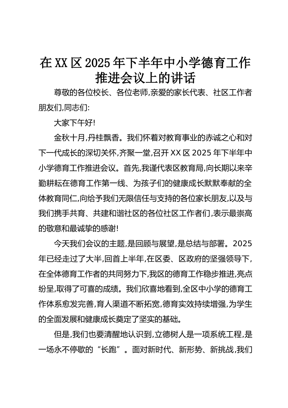 在XX區(qū)2025年下半年中小學德育工作推進會議上的講話尊敬的各位校長、各位老師,親愛的家長代表、社區(qū)工作者朋友們,同志們:大家下午好!金秋十月,丹桂飄香。我們懷著對教育事業(yè)的赤誠之心和對下一代成長的深切關(guān)懷,齊聚一堂,召開XX區(qū)2025年下半年中小學德育工作推進會議。首先,我謹代表區(qū)教育局,向長期以來辛勤耕耘在德育工作第一線、為孩子們的健康成長默默奉獻的全體教育同仁,向給予我們無限信任與支持的各位家長朋友,以及與我們攜手共育、共建和諧社區(qū)的各位社區(qū)工作者們,表示最崇高的敬意和最誠摯的感謝!今天我們會議的主題,是回顧與展望,是總結(jié)與部署。2025年已經(jīng)走過...