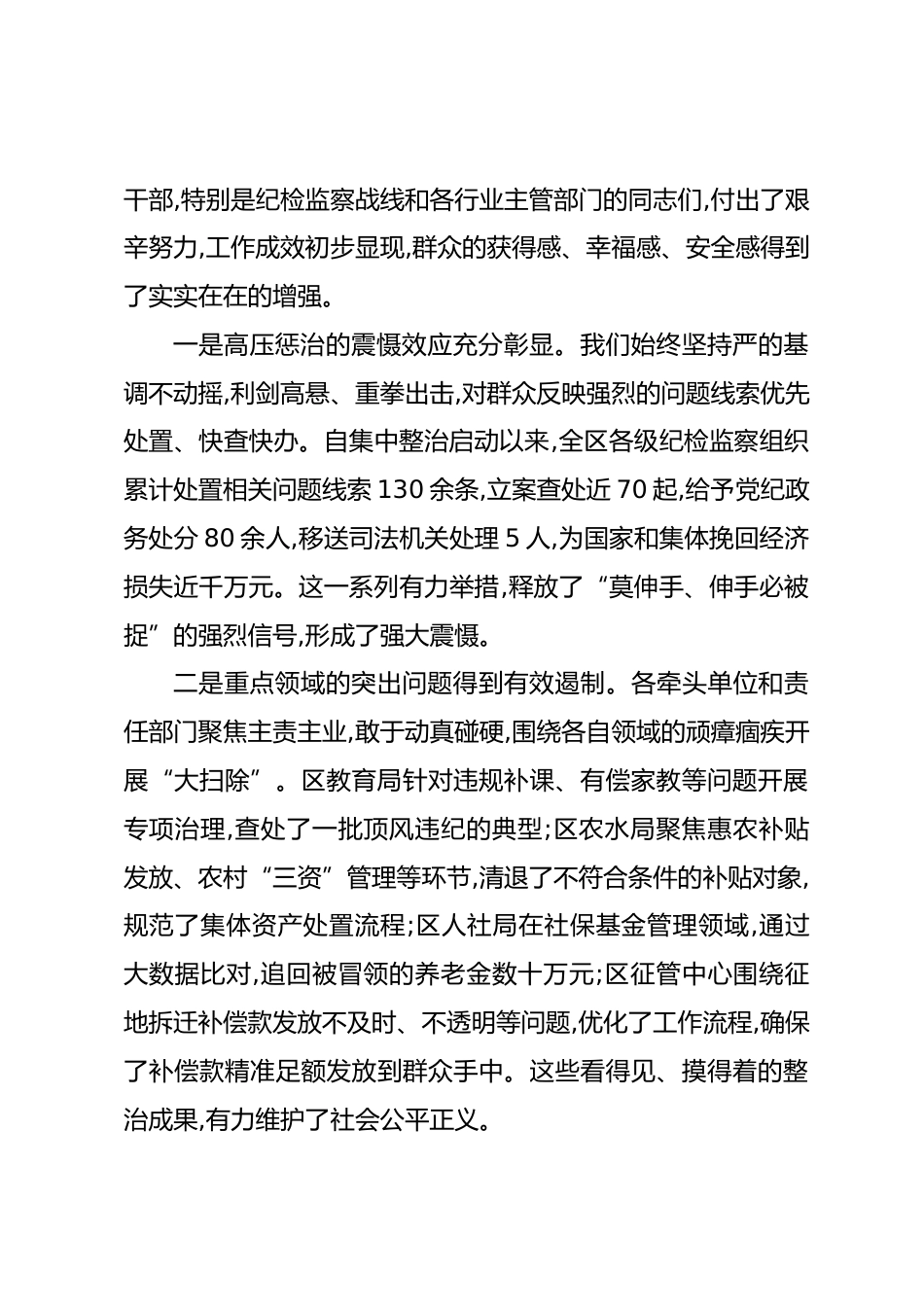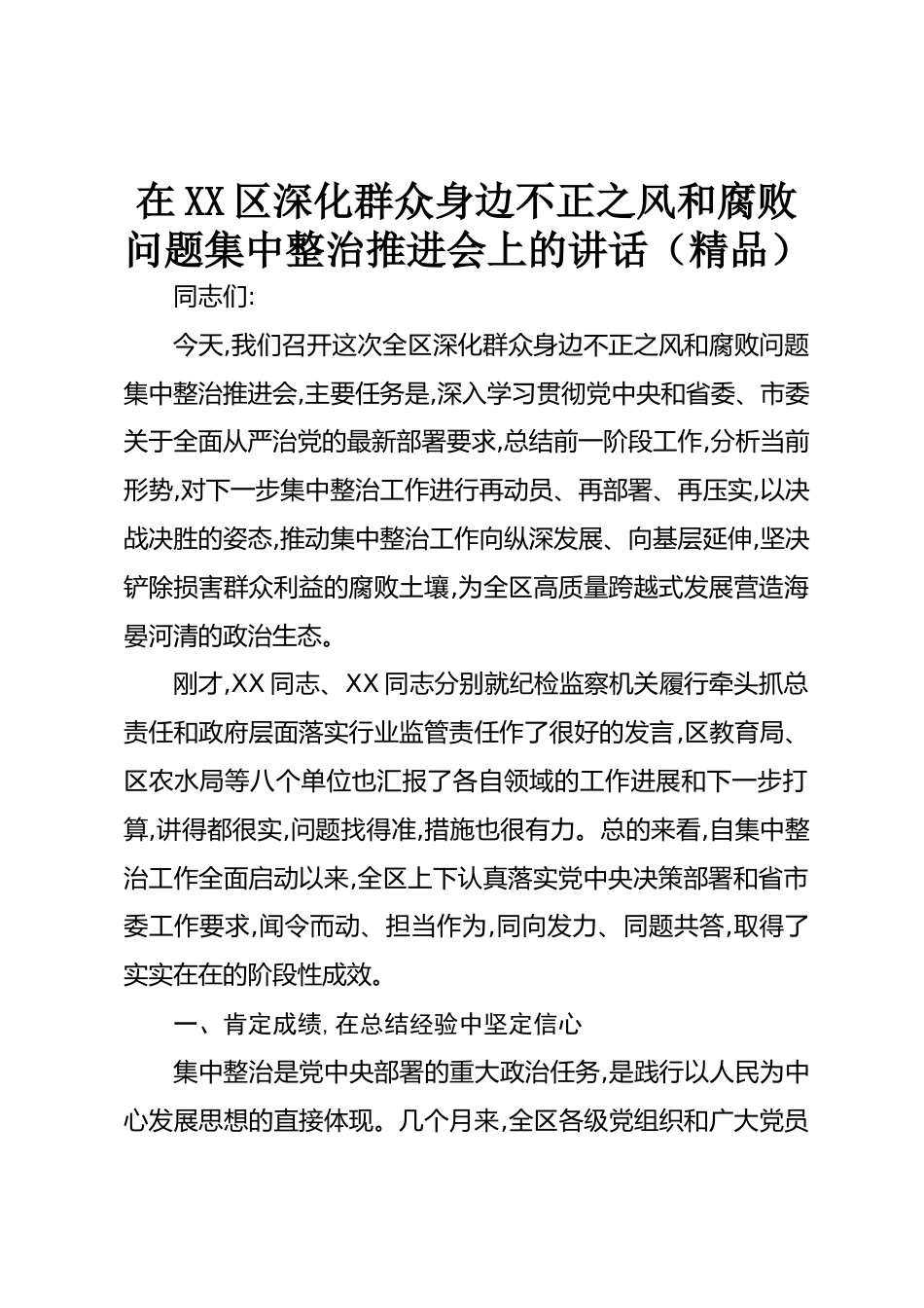 在XX區(qū)深化群眾身邊不正之風(fēng)和腐敗問(wèn)題集中整治推進(jìn)會(huì)上的講話(精品)同志們:今天,我們召開(kāi)這次全區(qū)深化群眾身邊不正之風(fēng)和腐敗問(wèn)題集中整治推進(jìn)會(huì),主要任務(wù)是,深入學(xué)習(xí)貫徹黨中央和省委、市委關(guān)于全面從嚴(yán)治黨的最新部署要求,總結(jié)前一階段工作,分析當(dāng)前形勢(shì),對(duì)下一步集中整治工作進(jìn)行再動(dòng)員、再部署、再壓實(shí),以決戰(zhàn)決勝的姿態(tài),推動(dòng)集中整治工作向縱深發(fā)展、向基層延伸,堅(jiān)決鏟除損害群眾利益的腐敗土壤,為全區(qū)高質(zhì)量跨越式發(fā)展?fàn)I造海晏河清的政治生態(tài)。剛才,XX同志、XX同志分別就紀(jì)檢監(jiān)察機(jī)關(guān)履行牽頭抓總責(zé)任和政府層面落實(shí)行業(yè)監(jiān)管責(zé)任作了很好的發(fā)言,區(qū)教育局、區(qū)農(nóng)...