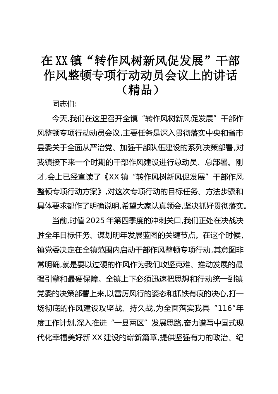 在XX鎮(zhèn)“轉(zhuǎn)作風(fēng)樹新風(fēng)促發(fā)展”干部作風(fēng)整頓專項行動動員會議上的講話(精品)同志們:今天,我們在這里召開全鎮(zhèn)“轉(zhuǎn)作風(fēng)樹新風(fēng)促發(fā)展”干部作風(fēng)整頓專項行動動員會議,主要任務(wù)是深入貫徹落實中央和省市縣委關(guān)于全面從嚴(yán)治黨、加強干部隊伍建設(shè)的系列決策部署,對我鎮(zhèn)接下來一個時期的干部作風(fēng)建設(shè)進(jìn)行總動員、總部署。剛才,會上已經(jīng)宣讀了《XX鎮(zhèn)“轉(zhuǎn)作風(fēng)樹新風(fēng)促發(fā)展”干部作風(fēng)整頓專項行動方案》,對這次專項行動的目標(biāo)任務(wù)、方法步驟和具體要求都作了明確說明,希望大家認(rèn)真領(lǐng)會,堅決抓好貫徹落實。當(dāng)前,時值2025年第四季度的沖刺關(guān)口,我們正處在決戰(zhàn)決勝全年目標(biāo)任務(wù)、謀劃...