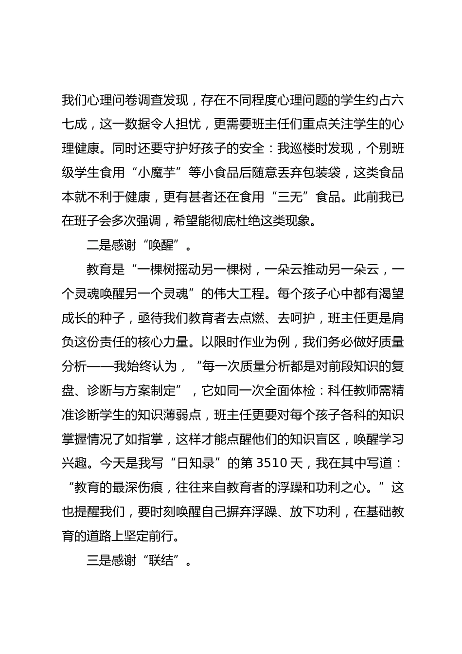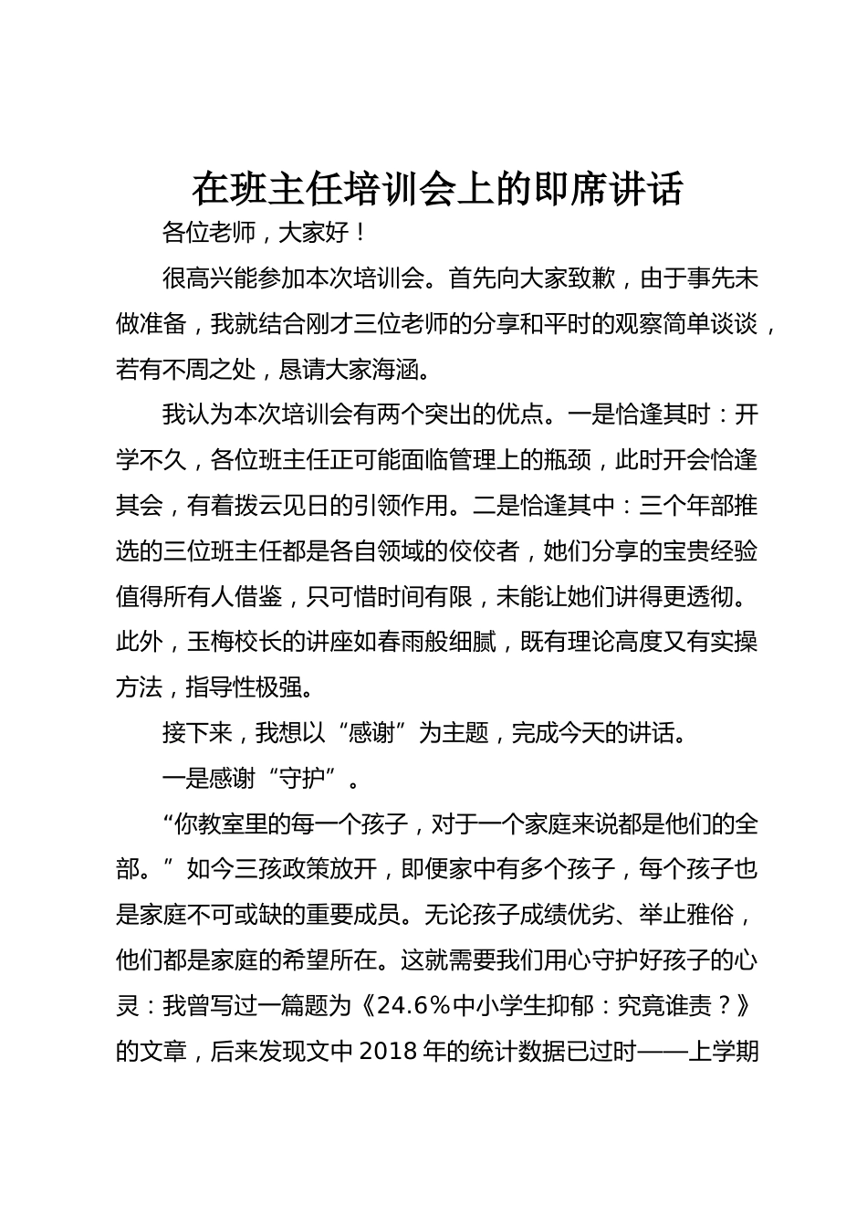 在班主任培訓會上的即席講話各位老師,大家好!很高興能參加本次培訓會。首先向大家致歉,由于事先未做準備,我就結合剛才三位老師的分享和平時的觀察簡單談談,若有不周之處,懇請大家海涵。我認為本次培訓會有兩個突出的優(yōu)點。一是恰逢其時:開學不久,各位班主任正可能面臨管理上的瓶頸,此時開會恰逢其會,有著撥云見日的引領作用。二是恰逢其中:三個年部推選的三位班主任都是各自領域的佼佼者,她們分享的寶貴經(jīng)驗值得所有人借鑒,只可惜時間有限,未能讓她們講得更透徹。此外,玉梅校長的講座如春雨般細膩,既有理論高度又有實操方法,指導性極強。接下來,我想以...