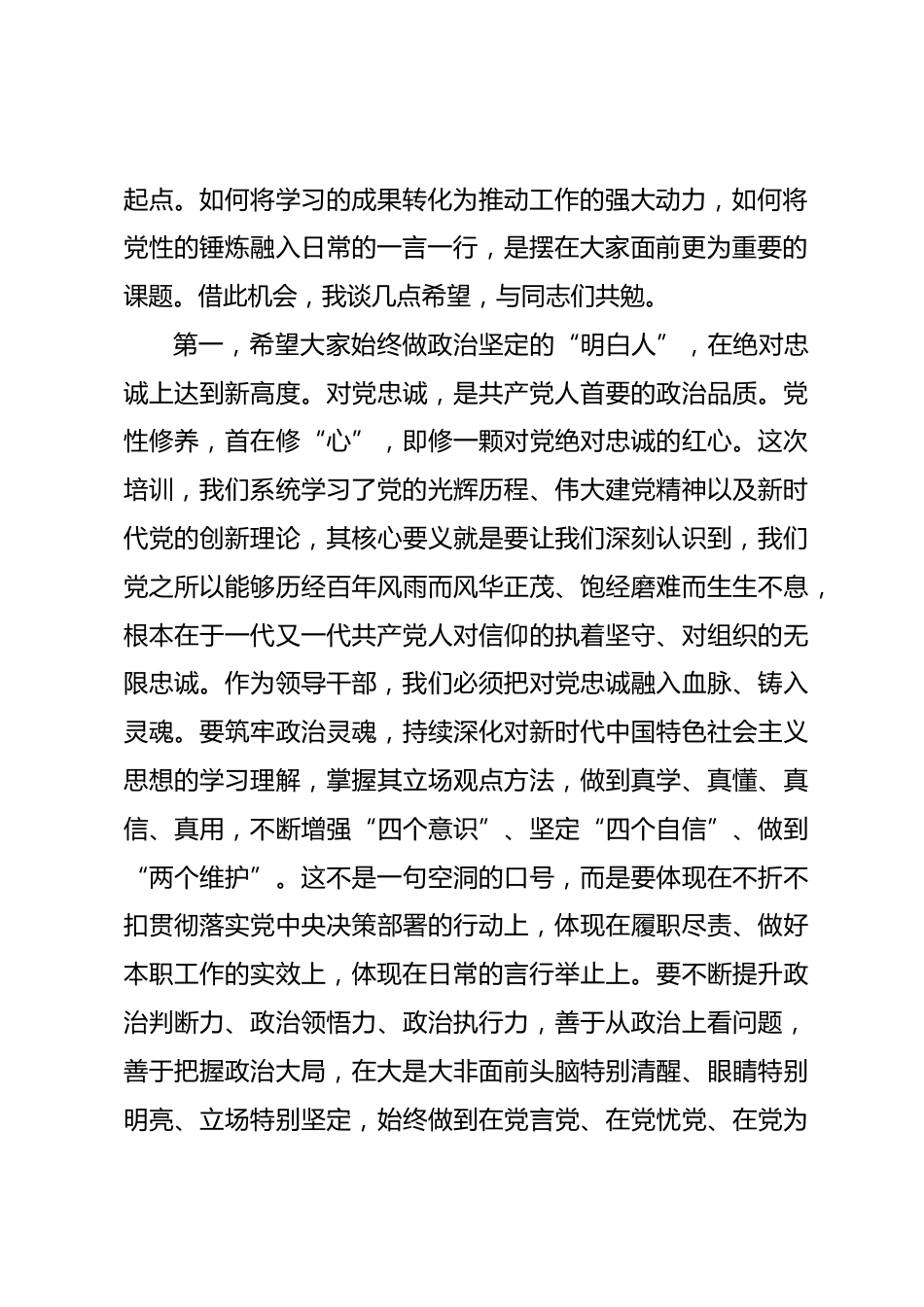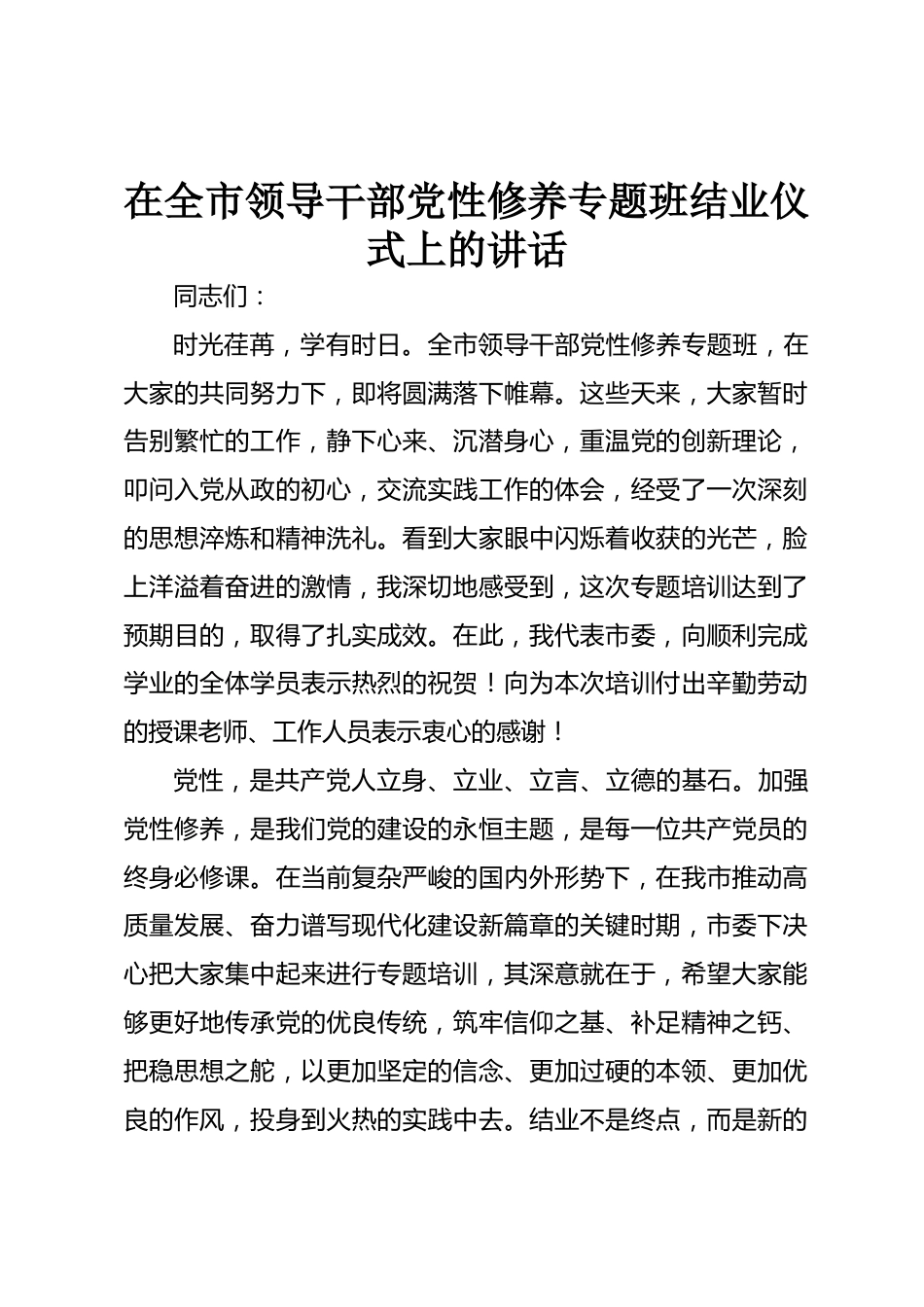 在全市領(lǐng)導(dǎo)干部黨性修養(yǎng)專題班結(jié)業(yè)儀式上的講話同志們:時光荏苒,學(xué)有時日。全市領(lǐng)導(dǎo)干部黨性修養(yǎng)專題班,在大家的共同努力下,即將圓滿落下帷幕。這些天來,大家暫時告別繁忙的工作,靜下心來、沉潛身心,重溫黨的創(chuàng)新理論,叩問入黨從政的初心,交流實踐工作的體會,經(jīng)受了一次深刻的思想淬煉和精神洗禮??吹酱蠹已壑虚W爍著收獲的光芒,臉上洋溢著奮進(jìn)的激情,我深切地感受到,這次專題培訓(xùn)達(dá)到了預(yù)期目的,取得了扎實成效。在此,我代表市委,向順利完成學(xué)業(yè)的全體學(xué)員表示熱烈的祝賀!向為本次培訓(xùn)付出辛勤勞動的授課老師、工作人員表示衷心的感謝!黨性,是共產(chǎn)黨...