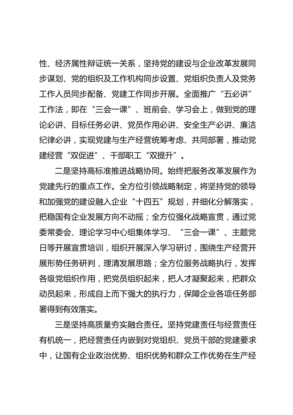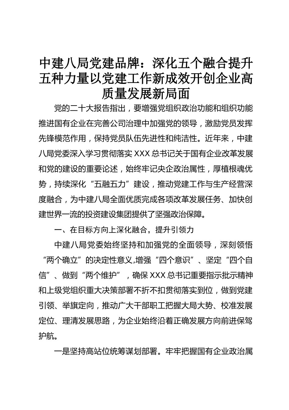 中建八局黨建品牌:深化五個融合提升五種力量以黨建工作新成效開創(chuàng)企業(yè)高質(zhì)量發(fā)展新局面黨的二十大報告指出,要增強黨組織政治功能和組織功能推進國有企業(yè)在完善公司治理中加強黨的領(lǐng)導(dǎo),激勵黨員發(fā)揮先鋒模范作用,保持黨員隊伍先進性和純潔性。近年來,中建八局黨委深入學(xué)習(xí)貫徹落實XXX總書記關(guān)于國有企業(yè)改革發(fā)展和黨的建設(shè)的重要論述,始終牢記央企政治屬性,厚植根魂優(yōu)勢,持續(xù)深化“五融五力”建設(shè),推動黨建工作與生產(chǎn)經(jīng)營深度融合,為中建八局全面優(yōu)質(zhì)完成各項改革發(fā)展任務(wù)、加快創(chuàng)建世界一流的投資建設(shè)集團提供了堅強政治保障。一、在目標(biāo)方向上深化融合,提升...