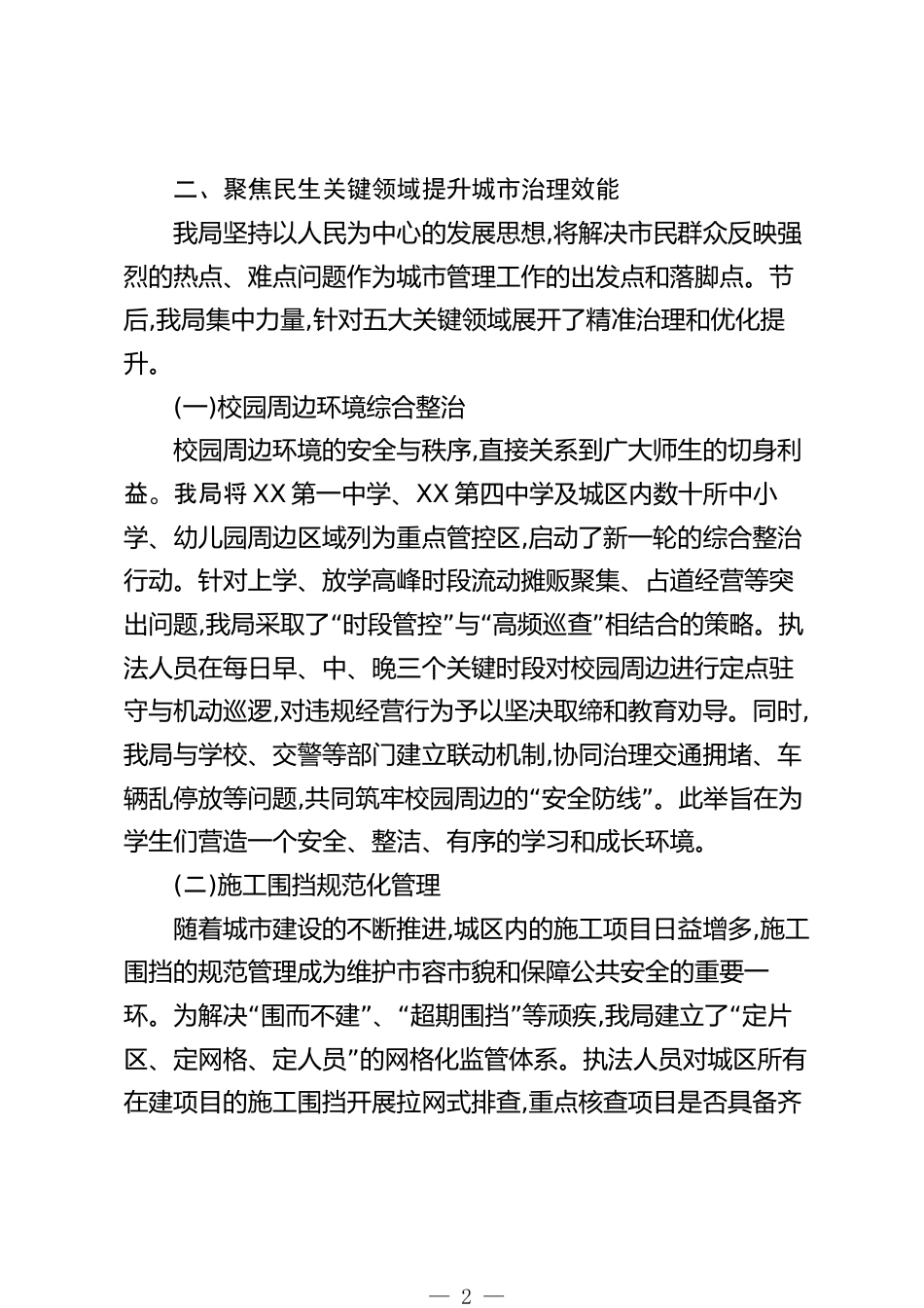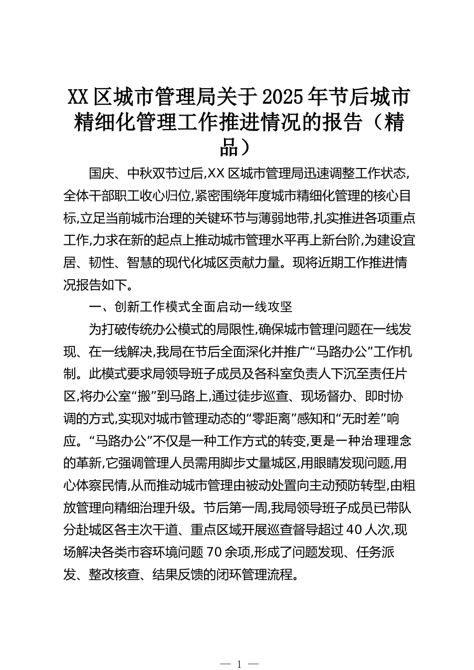 XX區(qū)城市管理局關(guān)于2025年節(jié)后城市精細(xì)化管理工作推進(jìn)情況的報(bào)告(精品)國(guó)慶、中秋雙節(jié)過(guò)后,XX區(qū)城市管理局迅速調(diào)整工作狀態(tài),全體干部職工收心歸位,緊密?chē)@年度城市精細(xì)化管理的核心目標(biāo),立足當(dāng)前城市治理的關(guān)鍵環(huán)節(jié)與薄弱地帶,扎實(shí)推進(jìn)各項(xiàng)重點(diǎn)工作,力求在新的起點(diǎn)上推動(dòng)城市管理水平再上新臺(tái)階,為建設(shè)宜居、韌性、智慧的現(xiàn)代化城區(qū)貢獻(xiàn)力量。現(xiàn)將近期工作推進(jìn)情況報(bào)告如下。一、創(chuàng)新工作模式全面啟動(dòng)一線攻堅(jiān)為打破傳統(tǒng)辦公模式的局限性,確保城市管理問(wèn)題在一線發(fā)現(xiàn)、在一線解決,“”我局在節(jié)后全面深化并推廣馬路辦公工作機(jī)制。此模式要求局領(lǐng)導(dǎo)班子成員及各科室負(fù)...