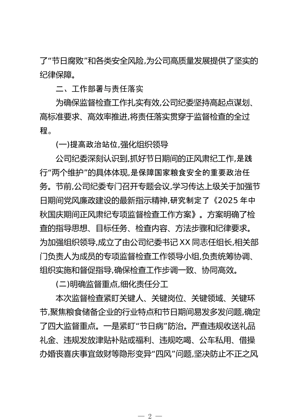 XX省儲(chǔ)備糧有限公司紀(jì)委2025年中秋國(guó)慶期間正風(fēng)肅紀(jì)專項(xiàng)監(jiān)督檢查工作總結(jié)報(bào)告(精品)