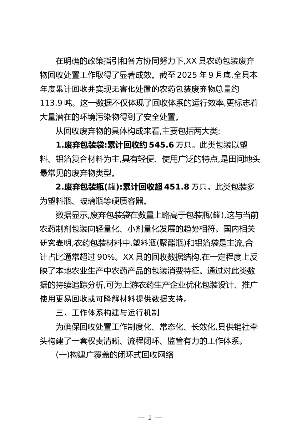XX縣供銷合作社關(guān)于農(nóng)藥包裝廢棄物回收處置工作的情況報告(精品)為深入貫徹落實國家關(guān)于生態(tài)文明建設(shè)的戰(zhàn)略部署,有效防治農(nóng)業(yè)面源污染,保障農(nóng)產(chǎn)品質(zhì)量安全與人民群眾身體健康,XX縣供銷合作社立足職能定位,將農(nóng)藥包裝廢棄物回收處置工作作“”為服務(wù)三農(nóng)和筑牢區(qū)域生態(tài)安全屏障的關(guān)鍵舉措。本報告旨在全面總結(jié)當(dāng)前工作進(jìn)展、主要成效、運(yùn)行機(jī)制及未來規(guī)劃,以期為持續(xù)深化此項工作提供決策參考。一、工作背景與政策遵循農(nóng)藥包裝廢棄物因其殘留有毒有害物質(zhì),若隨意丟棄,將對土壤、水體等生態(tài)環(huán)境構(gòu)成嚴(yán)重威脅,并可能通過食物鏈危及公眾健康。開展系統(tǒng)化、規(guī)范化的回收處置...