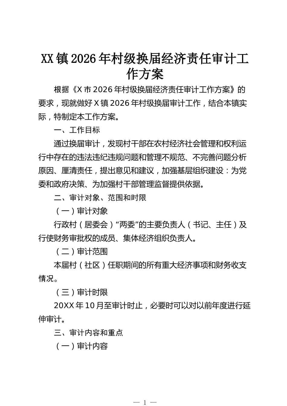 XX鎮(zhèn)2026年村級換屆經(jīng)濟責(zé)任審計工作方案