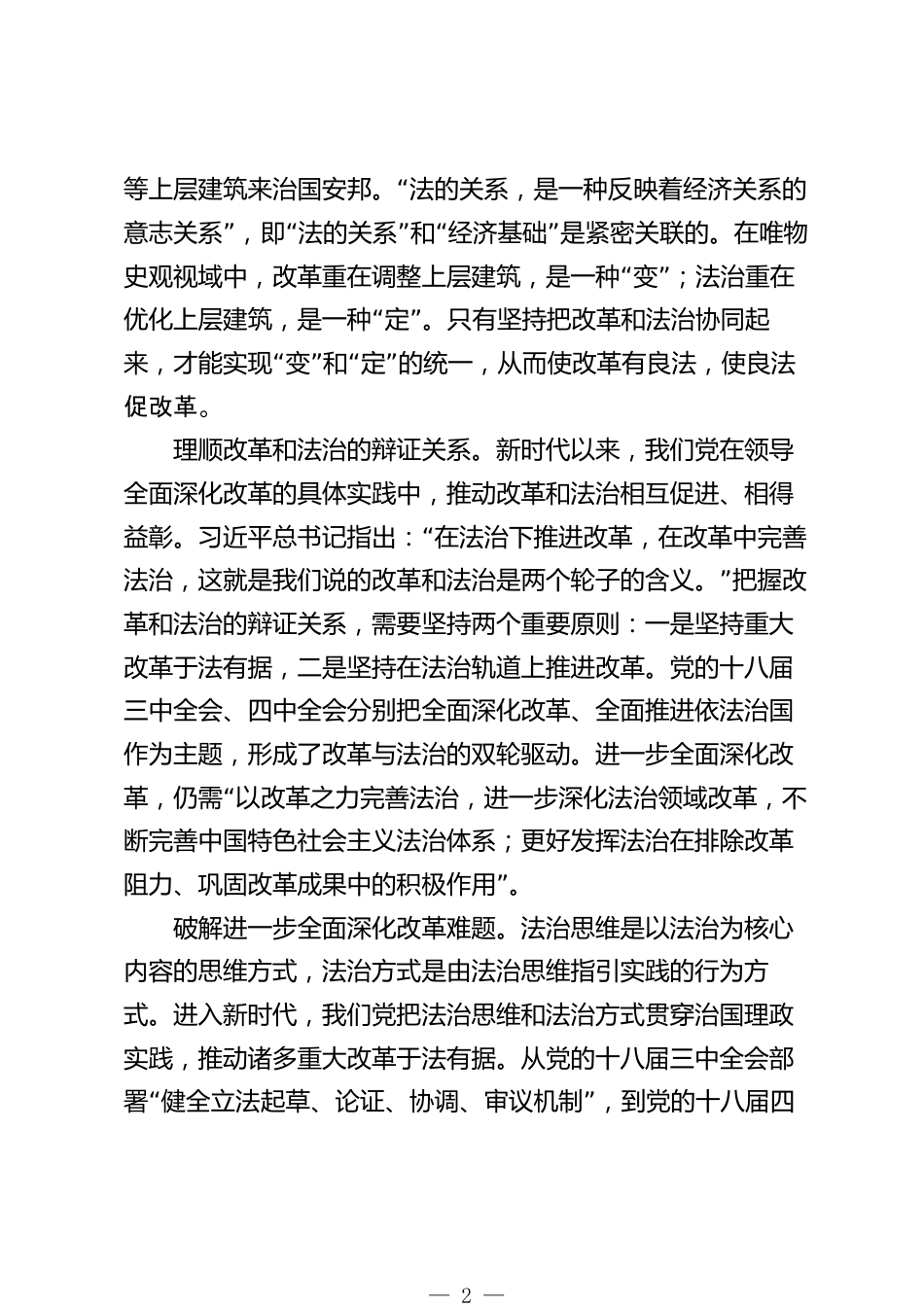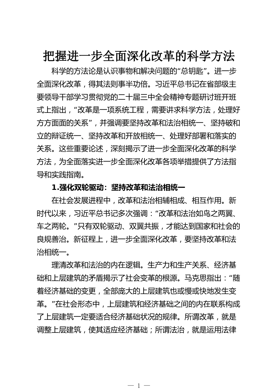 把握進(jìn)一步全面深化改革的科學(xué)方法“”科學(xué)的方法論是認(rèn)識(shí)事物和解決問題的總鑰匙。進(jìn)一步全面深化改革,得其法則事半功倍。習(xí)近平總書記在省部級(jí)主要領(lǐng)導(dǎo)干部學(xué)習(xí)貫徹黨的二十屆三中全會(huì)精神專題研討班開班“式上指出,改革是一項(xiàng)系統(tǒng)工程,需要講求科學(xué)方法,處理好”方方面面的關(guān)系,并強(qiáng)調(diào)要堅(jiān)持改革和法治相統(tǒng)一、堅(jiān)持破和立的辯證統(tǒng)一、堅(jiān)持改革和開放相統(tǒng)一、處理好部署和落實(shí)的關(guān)系。這些重要論述,深刻揭示了進(jìn)一步全面深化改革的科學(xué)方法,為全面落實(shí)進(jìn)一步全面深化改革各項(xiàng)舉措提供了方法指導(dǎo)和實(shí)踐指南。1.強(qiáng)化雙輪驅(qū)動(dòng):堅(jiān)持改革和法治相統(tǒng)一在社會(huì)發(fā)展進(jìn)程...