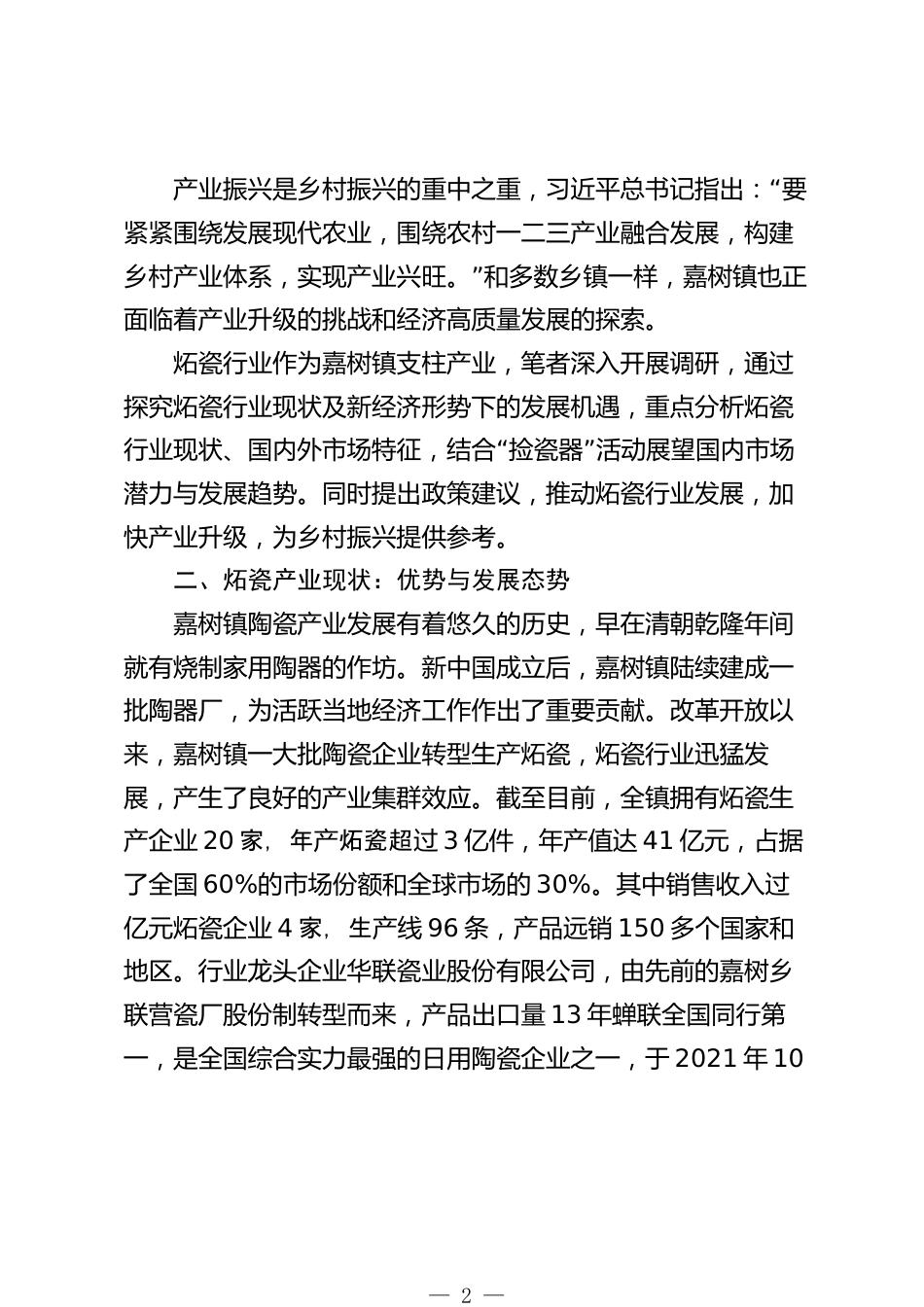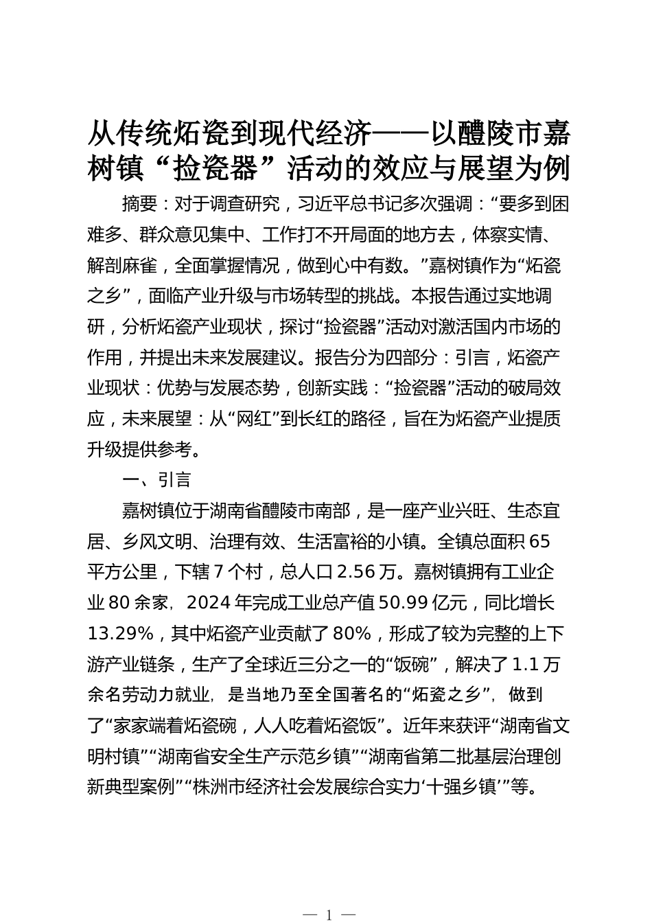 從傳統(tǒng)炻瓷到現(xiàn)代經(jīng)濟(jì)——以醴陵市嘉樹鎮(zhèn)“撿瓷器”活動的效應(yīng)與展望為例“摘要:對于調(diào)查研究,習(xí)近平總書記多次強(qiáng)調(diào):要多到困難多、群眾意見集中、工作打不開局面的地方去,體察實(shí)情、”“解剖麻雀,全面掌握情況,做到心中有數(shù)。嘉樹鎮(zhèn)作為炻瓷”之鄉(xiāng),面臨產(chǎn)業(yè)升級與市場轉(zhuǎn)型的挑戰(zhàn)。本報告通過實(shí)地調(diào)“”研,分析炻瓷產(chǎn)業(yè)現(xiàn)狀,探討撿瓷器活動對激活國內(nèi)市場的作用,并提出未來發(fā)展建議。報告分為四部分:引言,炻瓷產(chǎn)“”業(yè)現(xiàn)狀:優(yōu)勢與發(fā)展態(tài)勢,創(chuàng)新實(shí)踐:撿瓷器活動的破局效“”應(yīng),未來展望:從網(wǎng)紅到長紅的路徑,旨在為炻瓷產(chǎn)業(yè)提質(zhì)升級提供參考。一、引言嘉...