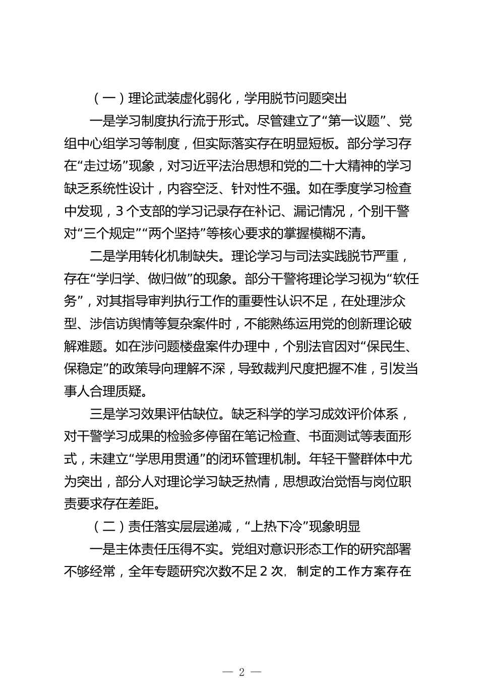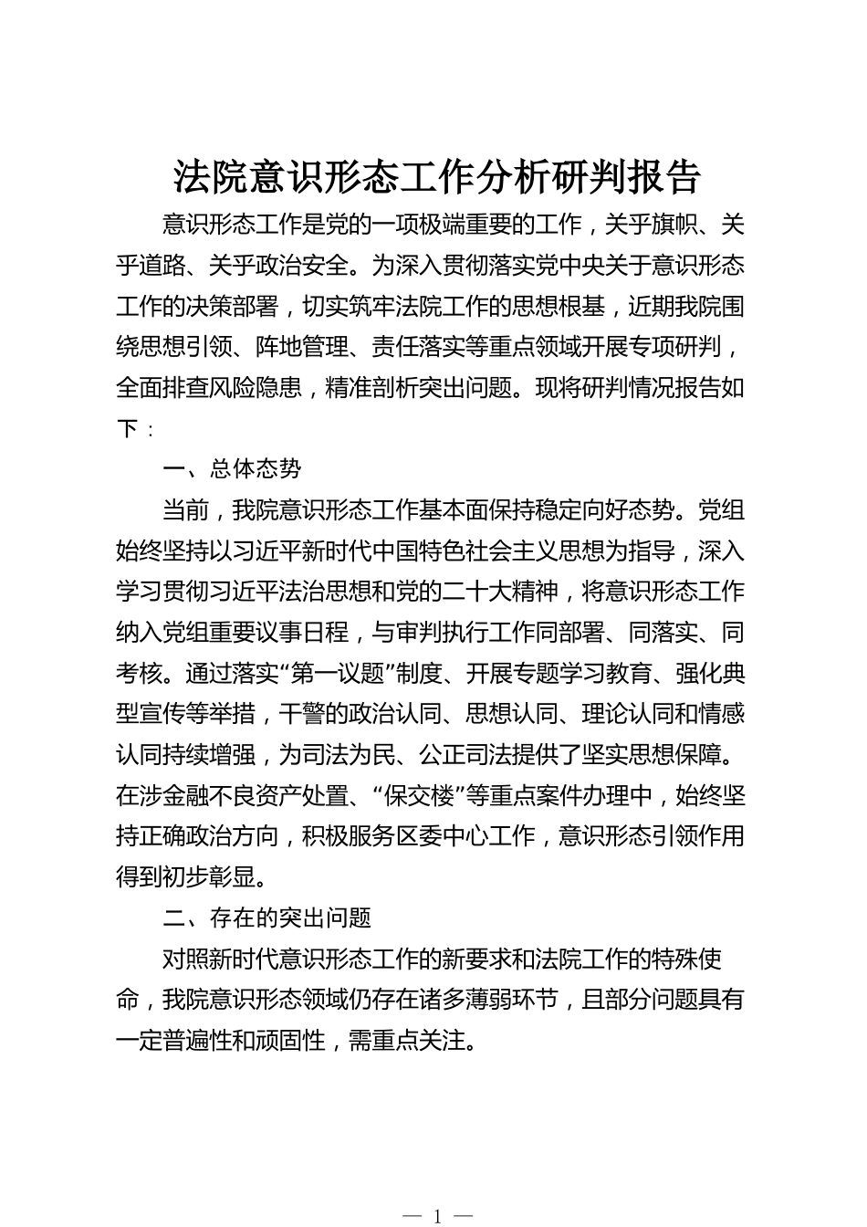 法院意識形態(tài)工作分析研判報告意識形態(tài)工作是黨的一項極端重要的工作,關乎旗幟、關乎道路、關乎政治安全。為深入貫徹落實黨中央關于意識形態(tài)工作的決策部署,切實筑牢法院工作的思想根基,近期我院圍繞思想引領、陣地管理、責任落實等重點領域開展專項研判,全面排查風險隱患,精準剖析突出問題。現(xiàn)將研判情況報告如下:一、總體態(tài)勢當前,我院意識形態(tài)工作基本面保持穩(wěn)定向好態(tài)勢。黨組始終堅持以習近平新時代中國特色社會主義思想為指導,深入學習貫徹習近平法治思想和黨的二十大精神,將意識形態(tài)工作納入黨組重要議事日程,與審判執(zhí)行工作同部署、同落實、同“”考核...