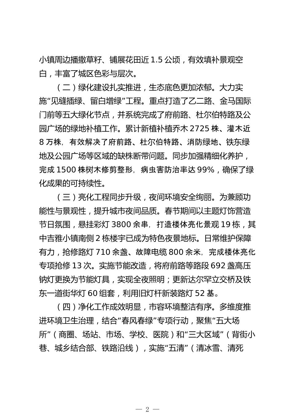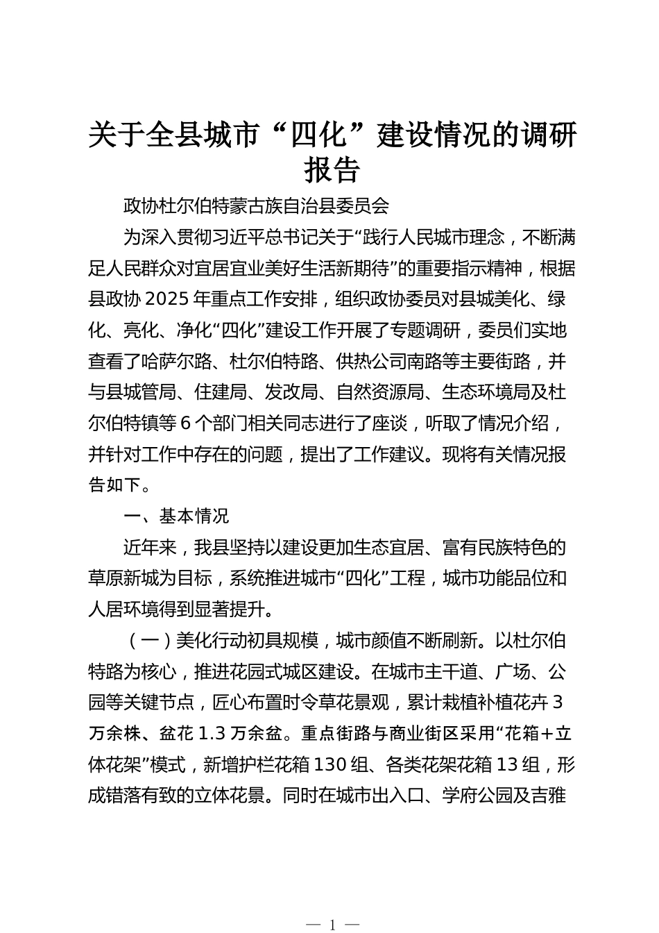 關(guān)于全縣城市“四化”建設(shè)情況的調(diào)研報(bào)告政協(xié)杜爾伯特蒙古族自治縣委員會(huì)“為深入貫徹習(xí)近平總書記關(guān)于踐行人民城市理念,不斷滿”足人民群眾對(duì)宜居宜業(yè)美好生活新期待的重要指示精神,根據(jù)縣政協(xié)2025年重點(diǎn)工作安排,組織政協(xié)委員對(duì)縣城美化、綠“”化、亮化、凈化四化建設(shè)工作開展了專題調(diào)研,委員們實(shí)地查看了哈薩爾路、杜爾伯特路、供熱公司南路等主要街路,并與縣城管局、住建局、發(fā)改局、自然資源局、生態(tài)環(huán)境局及杜爾伯特鎮(zhèn)等6個(gè)部門相關(guān)同志進(jìn)行了座談,聽取了情況介紹,并針對(duì)工作中存在的問題,提出了工作建議。現(xiàn)將有關(guān)情況報(bào)告如下。一、基本情況近年來,我...