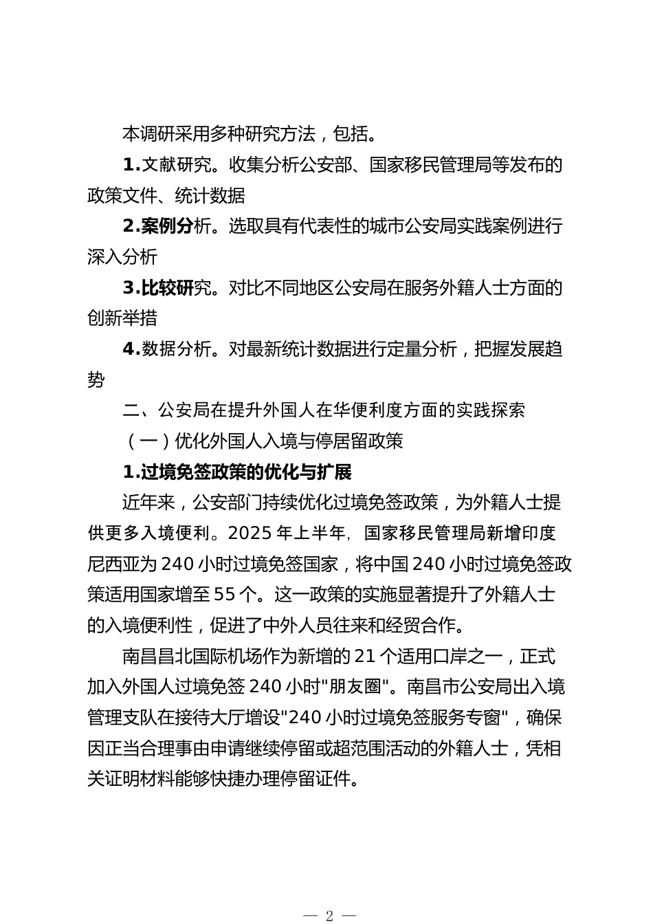 關(guān)于提升外國人在華便利度的調(diào)研報告一、項目背景與調(diào)研概述隨著中國高水平開放和國際化進(jìn)程的加速,吸引和服務(wù)外籍人士已成為提升城市國際競爭力的重要方面。2025年上半年,全國移民管理機構(gòu)累計查驗出入境人員3.33億人次,同比上升15.8%,其中外國人3805.3萬人次、同比上升30.2%。這一數(shù)據(jù)反映了中國對外籍人士吸引力的顯著增強。在此背景下,如何進(jìn)一步提升外國人在華便利度,尤其是從公安局職能角度優(yōu)化服務(wù)與管理,成為亟待研究的重要課題。本調(diào)研報告聚焦公安局在提升外國人在華便利度方面的實踐探索,深入分析營造外國人融入服務(wù)類環(huán)境的經(jīng)驗與不足,并對面向海外...