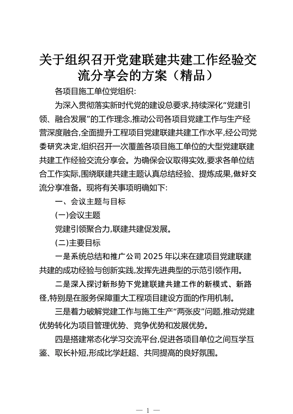 關(guān)于組織召開黨建聯(lián)建共建工作經(jīng)驗交流分享會的方案(精品)各項目施工單位黨組織:為深入貫徹落實新時代黨的建設(shè)總要求,“持續(xù)深化黨建引”領(lǐng)、融合發(fā)展的工作理念,推動公司各項目黨建工作與生產(chǎn)經(jīng)營深度融合,全面提升工程項目黨建聯(lián)建共建工作水平,經(jīng)公司黨委研究決定,組織召開一次覆蓋各項目施工單位的大型黨建聯(lián)建共建工作經(jīng)驗交流分享會。為確保會議取得實效,要求各單位結(jié)合工作實際,圍繞聯(lián)建共建主題認(rèn)真總結(jié)經(jīng)驗、提煉成果,做好交流分享準(zhǔn)備?,F(xiàn)將有關(guān)事項明確如下:一、會議主題與目標(biāo)(一)會議主題黨建引領(lǐng)聚合力,聯(lián)建共建促發(fā)展。(二)主要目標(biāo)一是系統(tǒng)總結(jié)和推廣...