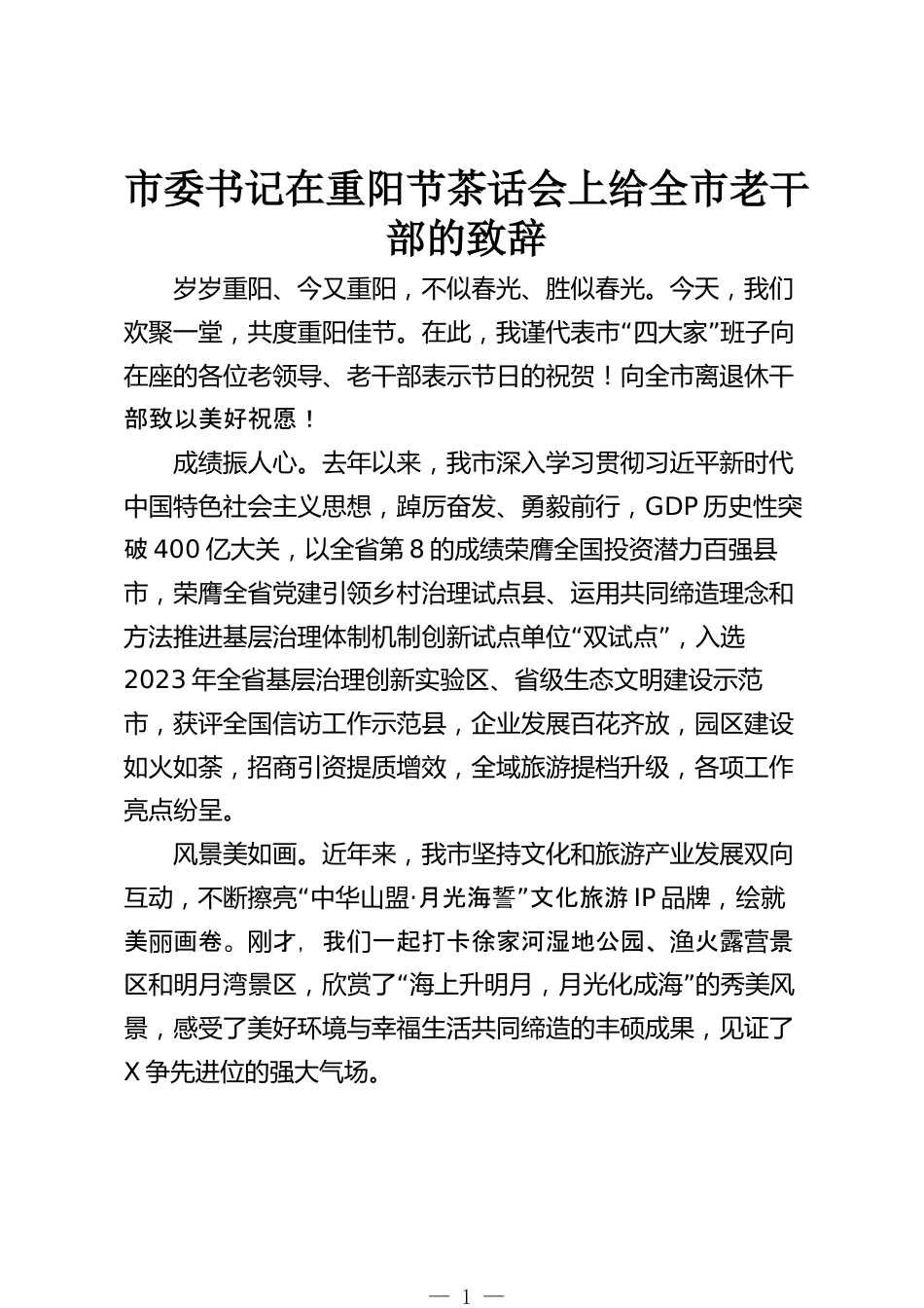 市委書記在重陽(yáng)節(jié)茶話會(huì)上給全市老干部的致辭