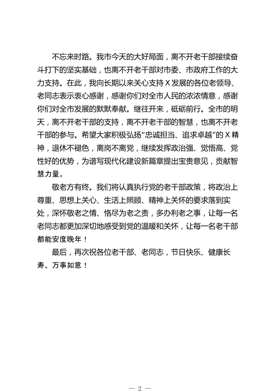 市委書記在重陽(yáng)節(jié)茶話會(huì)上給全市老干部的致辭歲歲重陽(yáng)、今又重陽(yáng),不似春光、勝似春光。今天,我們“”歡聚一堂,共度重陽(yáng)佳節(jié)。在此,我謹(jǐn)代表市四大家班子向在座的各位老領(lǐng)導(dǎo)、老干部表示節(jié)日的祝賀!向全市離退休干部致以美好祝愿!成績(jī)振人心。去年以來,我市深入學(xué)習(xí)貫徹習(xí)近平新時(shí)代中國(guó)特色社會(huì)主義思想,踔厲奮發(fā)、勇毅前行,GDP歷史性突破400億大關(guān),以全省第8的成績(jī)榮膺全國(guó)投資潛力百?gòu)?qiáng)縣市,榮膺全省黨建引領(lǐng)鄉(xiāng)村治理試點(diǎn)縣、運(yùn)用共同締造理念和“”方法推進(jìn)基層治理體制機(jī)制創(chuàng)新試點(diǎn)單位雙試點(diǎn),入選2023年全省基層治理創(chuàng)新實(shí)驗(yàn)區(qū)、省級(jí)生態(tài)文明建設(shè)示范市...