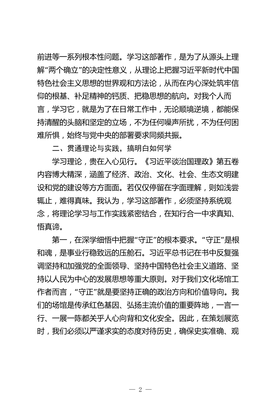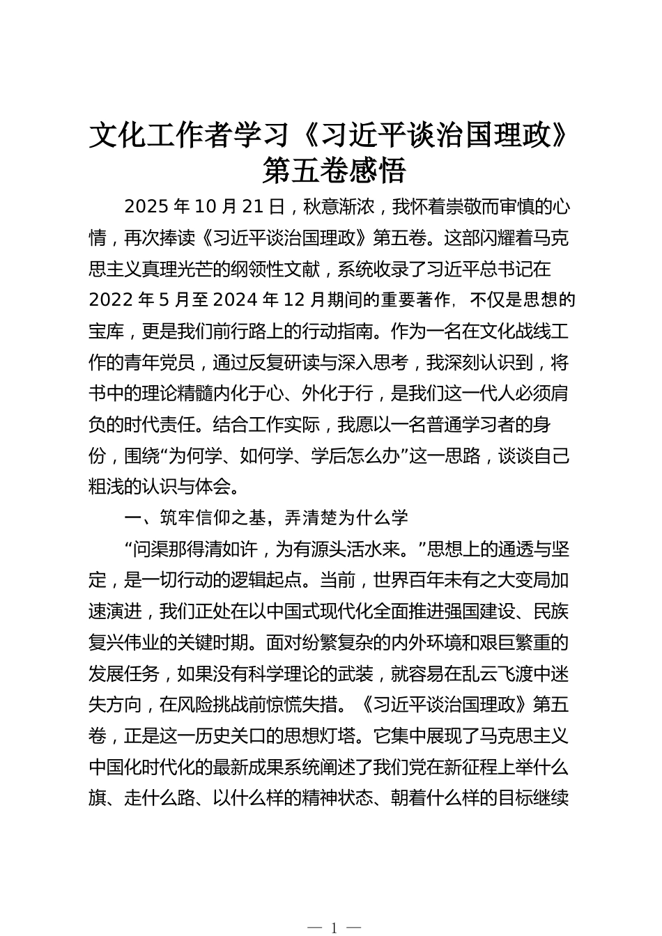 文化工作者學(xué)習(xí)《習(xí)近平談治國理政》第五卷感悟2025年10月21日,秋意漸濃,我懷著崇敬而審慎的心情,再次捧讀《習(xí)近平談治國理政》第五卷。這部閃耀著馬克思主義真理光芒的綱領(lǐng)性文獻(xiàn),系統(tǒng)收錄了習(xí)近平總書記在2022年5月至2024年12月期的重要著作,不是思想的間僅寶庫,更是我們前行路上的行動(dòng)指南。作為一名在文化戰(zhàn)線工作的青年黨員,通過反復(fù)研讀與深入思考,我深刻認(rèn)識(shí)到,將書中的理論精髓內(nèi)化于心、外化于行,是我們這一代人必須肩負(fù)的時(shí)代責(zé)任。結(jié)合工作實(shí)際,我愿以一名普通學(xué)習(xí)者的身“”份,圍繞為何學(xué)、如何學(xué)、學(xué)后怎么辦這一思路,談?wù)勛约捍譁\的認(rèn)識(shí)與體...