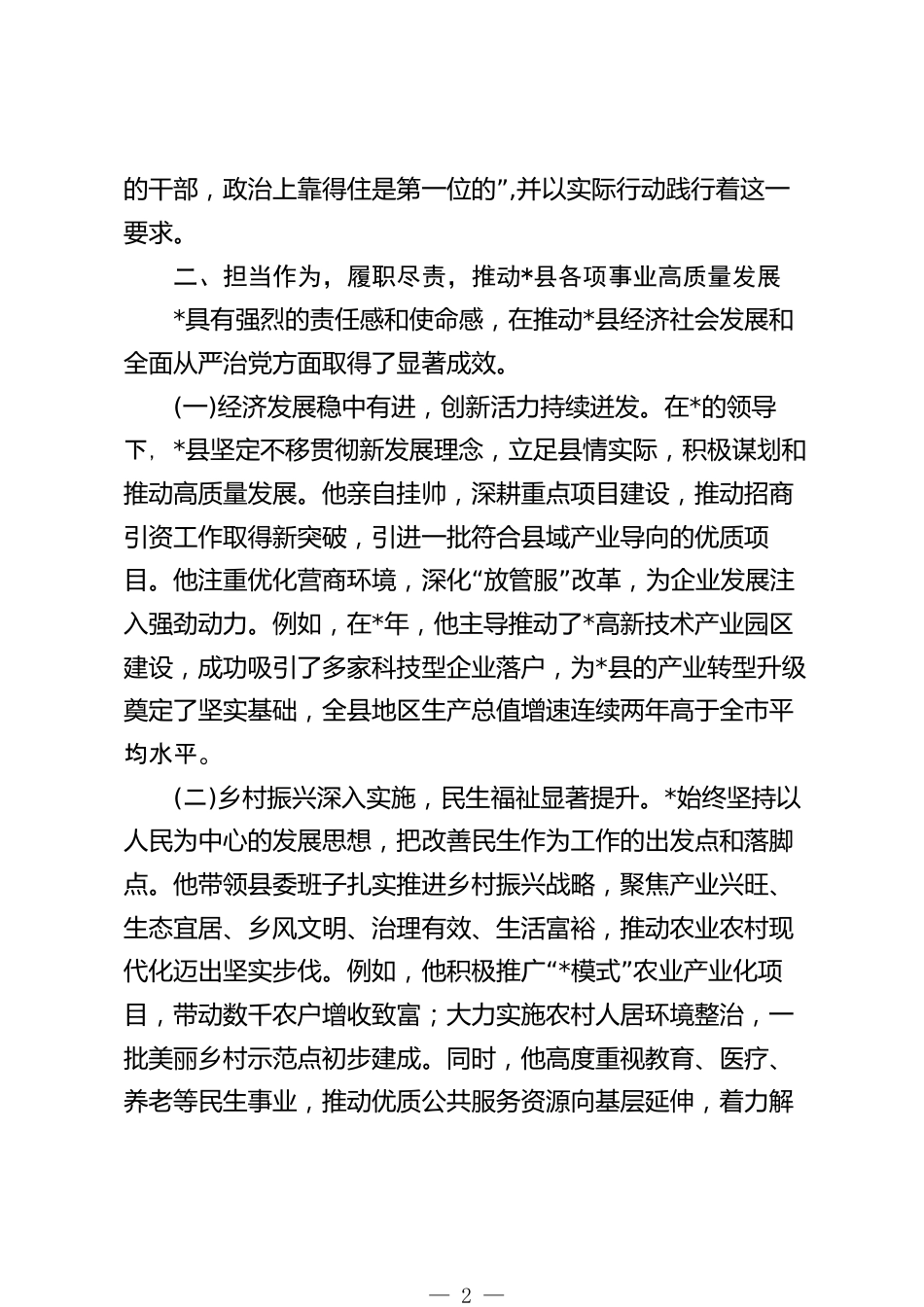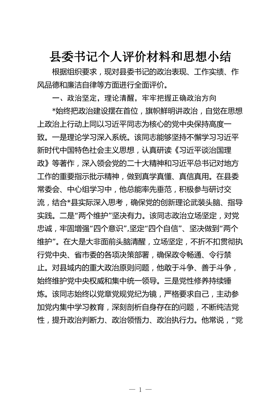 縣委書記個人評價材料和思想小結(jié)根據(jù)組織要求,現(xiàn)對縣委書記的政治表現(xiàn)、工作實績、作風(fēng)品德和廉潔自律等方面進(jìn)行全面評價。一、政治堅定,理論清醒,牢牢把握正確政治方向*始終把政治建設(shè)擺在首位,旗幟鮮明講政治,自覺在思想上政治上行動上同以習(xí)近平同志為核心的黨中央保持高度一致。一是理論學(xué)習(xí)深入系統(tǒng)。該同志能夠堅持不懈學(xué)習(xí)習(xí)近平新時代中國特色社會主義思想,認(rèn)真研讀《習(xí)近平談治國理政》等著作,深入領(lǐng)會黨的二十大精神和習(xí)近平總書記對地方工作的重要指示批示精神,做到真學(xué)真懂、真信真用。在縣委常委會、中心組學(xué)習(xí)中,他總能率先垂范,積極參與研討交...