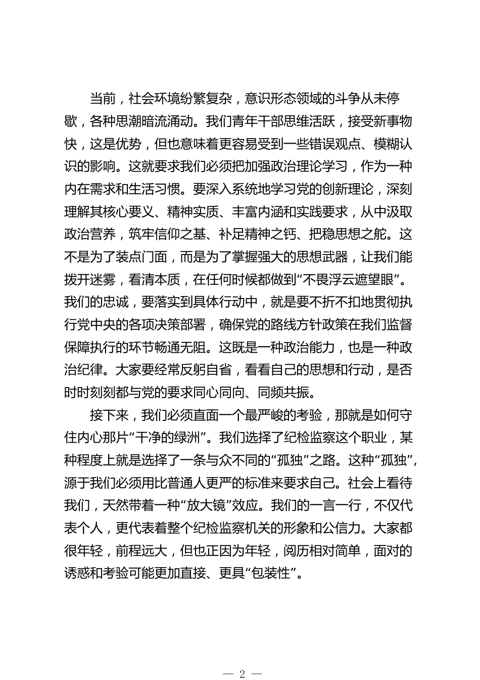 與青年紀(jì)檢監(jiān)察干部廉政談心會(huì)上的講話各位青年同仁,同志們:看到大家洋溢著青春熱情又帶著幾分紀(jì)檢干部特有沉穩(wěn)的面龐,我心中充滿了感慨與期待。你們是紀(jì)檢監(jiān)察事業(yè)的生力軍,是這場(chǎng)正風(fēng)肅紀(jì)反腐接力賽中,最具活力、最富潛力的一棒。今天,我們坐在一起,不像是嚴(yán)肅的工作會(huì)談,更像是一“次同行之間的交流,一次前輩與后輩的懇談。我想圍繞忠誠(chéng)、”干凈、擔(dān)當(dāng)這三個(gè)我們耳熟能詳?shù)脑~,和大家聊一聊心里話,談?wù)勅绾卧谖覀冞@個(gè)特殊的崗位上,走好腳下的路,守護(hù)好內(nèi)心的光。首先要談的,是植根于靈魂深處的忠誠(chéng)。這不僅僅是一句政治口號(hào),更是我們一切行動(dòng)的基石和燈...