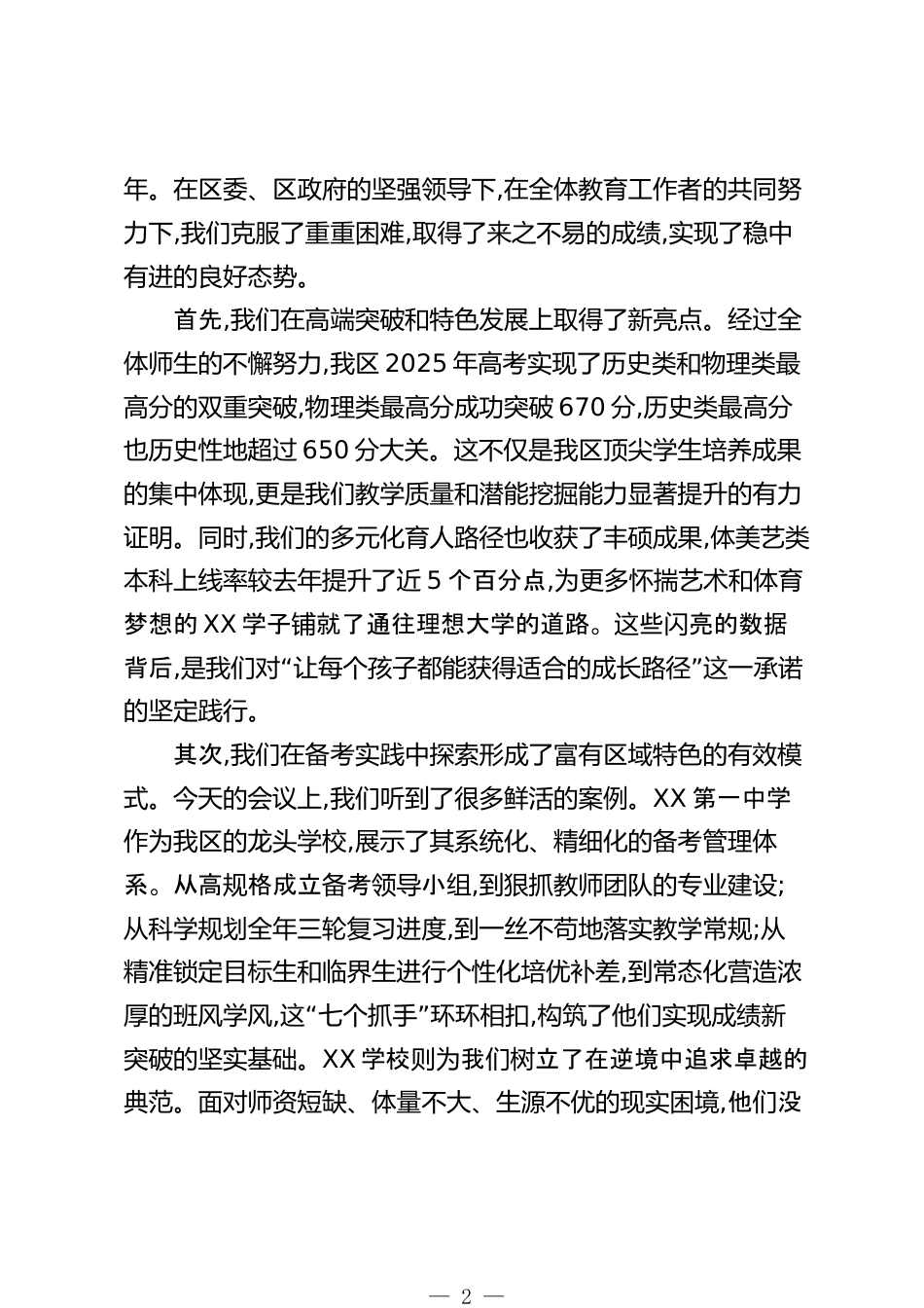在XX區(qū)2025年高考總結(jié)暨2026年高考備考座談會上的講話(精品)各位同志、各位校長、老師們:大家上午好。今天,我們懷著總結(jié)經(jīng)驗(yàn)、共謀未來的共同心愿,在這里召開XX區(qū)2025年高考總結(jié)暨2026年高考備考座談會。剛才,XX第一中學(xué)和XX學(xué)校的負(fù)責(zé)同志,以及兩位奮戰(zhàn)在一線的教師代表XX老師、XX老師,都從不同層面、不同角度分享了寶貴的備考經(jīng)驗(yàn)和深刻的教學(xué)感悟,講得非常實(shí)在,也很有啟發(fā)。XX副主任全面總結(jié)分析了我區(qū)2025年的高考情況,XX主任也對下階段工作提出了明確的期望和要求。他們的發(fā)言,為我們接下來的工作提供了清晰的鏡鑒和有力的抓手。借此機(jī)會,我代表區(qū)教育局,向在2025...