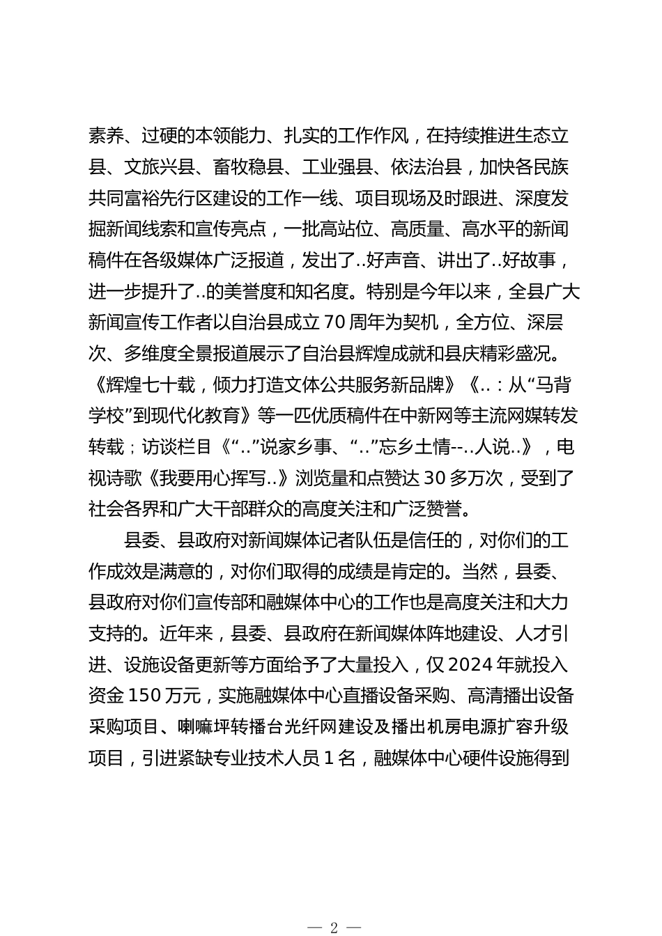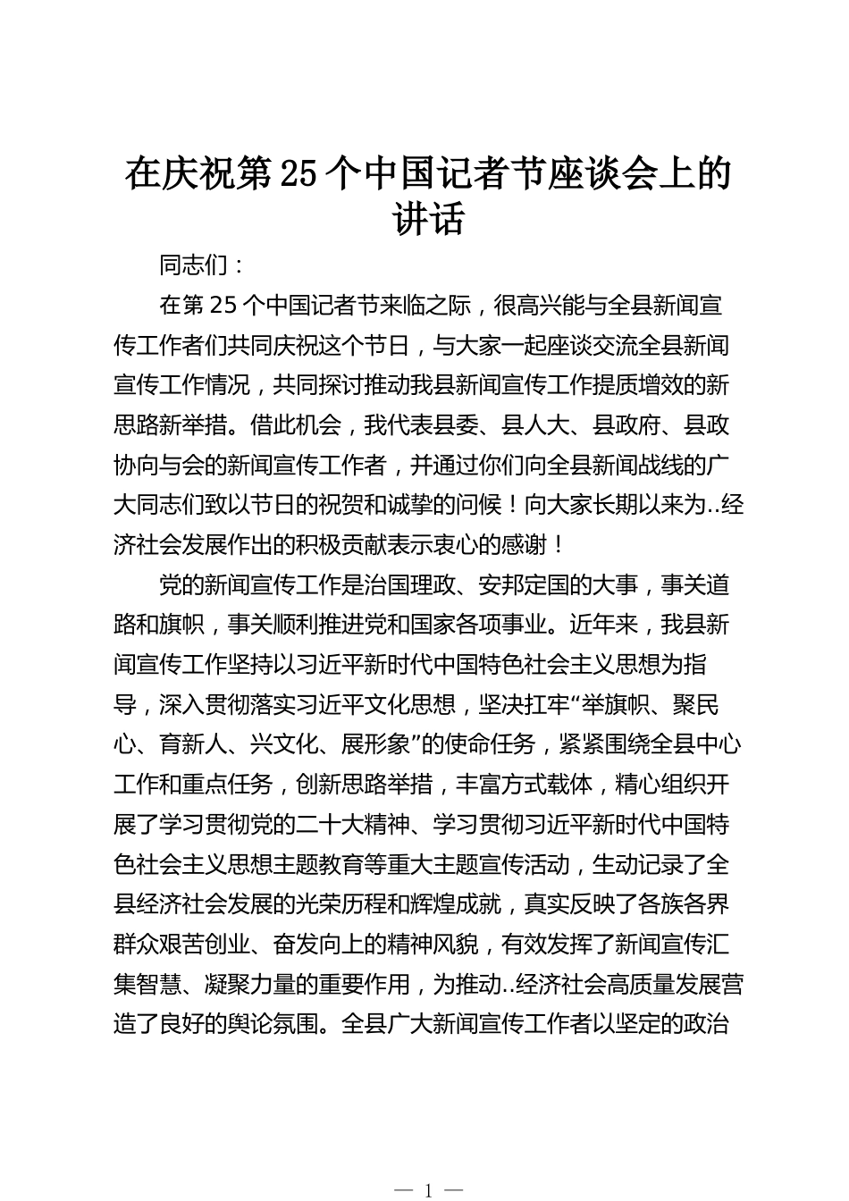 在慶祝第25個中國記者節(jié)座談會上的講話同志們:在第25個中國記者節(jié)來臨之際,很高興能與全縣新聞宣傳工作者們共同慶祝這個節(jié)日,與大家一起座談交流全縣新聞宣傳工作情況,共同探討推動我縣新聞宣傳工作提質增效的新思路新舉措。借此機會,我代表縣委、縣人大、縣政府、縣政協(xié)向與會的新聞宣傳工作者,并通過你們向全縣新聞戰(zhàn)線的廣大同志們致以節(jié)日的祝賀和誠摯的問候!向大家長期以來為..經濟社會發(fā)展作出的積極貢獻表示衷心的感謝!黨的新聞宣傳工作是治國理政、安邦定國的大事,事關道路和旗幟,事關順利推進黨和國家各項事業(yè)。近年來,我縣新聞宣傳工作堅持以習近平...