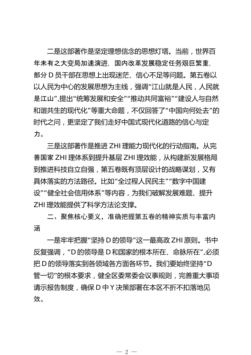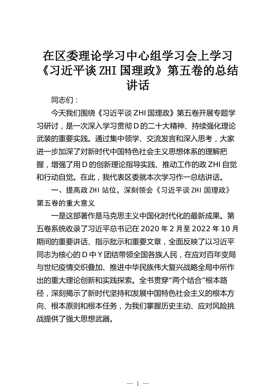 在區(qū)委理論學(xué)習(xí)中心組學(xué)習(xí)會(huì)上學(xué)習(xí)《習(xí)近平談ZHI國(guó)理政》第五卷的總結(jié)講話同志們:今天我們圍繞《習(xí)近平談ZHI國(guó)理政》第五卷開(kāi)展專(zhuān)題學(xué)習(xí)研討,是一次深入學(xué)習(xí)貫徹D的二十大精神、持續(xù)強(qiáng)化理論武裝的重要實(shí)踐。通過(guò)集中領(lǐng)學(xué)、交流發(fā)言和深入思考,大家進(jìn)一步加深了對(duì)新時(shí)代中國(guó)特色社會(huì)主義思想體系的理解把握,增強(qiáng)了用D的創(chuàng)新理論指導(dǎo)實(shí)踐、推動(dòng)工作的政ZHI自覺(jué)和行動(dòng)自覺(jué)。在此,我代表區(qū)委就本次學(xué)習(xí)作一總結(jié)講話。一、提高政ZHI站位,深刻領(lǐng)會(huì)《習(xí)近平談ZHI國(guó)理政》第五卷的重大意義一是這部著作是馬克思主義中國(guó)化時(shí)代化的最新成果。第五卷系統(tǒng)收錄了習(xí)近平總書(shū)記...