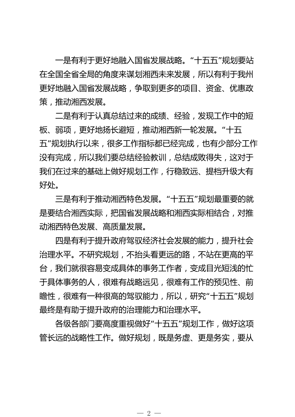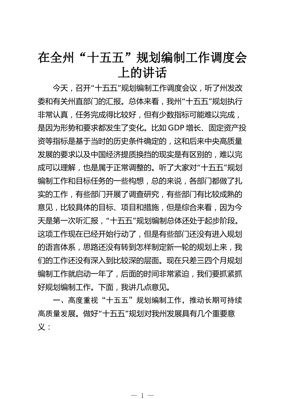 在全州“十五五”規(guī)劃編制工作調(diào)度會(huì)上的講話“”今天,召開十五五規(guī)劃編制工作調(diào)度會(huì)議,聽了州發(fā)改“”委和有關(guān)州直部門的匯報(bào)。總體來(lái)看,我州十五五規(guī)劃執(zhí)行非常認(rèn)真,任務(wù)完成得比較好,但有少數(shù)指標(biāo)可能難以完成,是因?yàn)樾蝿?shì)和要求都發(fā)生了變化。比如GDP增長(zhǎng)、固定資產(chǎn)投資等指標(biāo)是基于當(dāng)時(shí)的歷史條件確定的,這和后來(lái)中央高質(zhì)量發(fā)展的要求以及中國(guó)經(jīng)濟(jì)提質(zhì)換擋的現(xiàn)實(shí)是有區(qū)別的,難以完“”成可以理解,也是屬于正常調(diào)整的。聽了大家對(duì)十五五規(guī)劃編制工作和目標(biāo)任務(wù)的一些構(gòu)想,總的來(lái)說(shuō),各部門都做了扎實(shí)的工作,有些部門開展了調(diào)查研究,有些部門有比較成熟的...