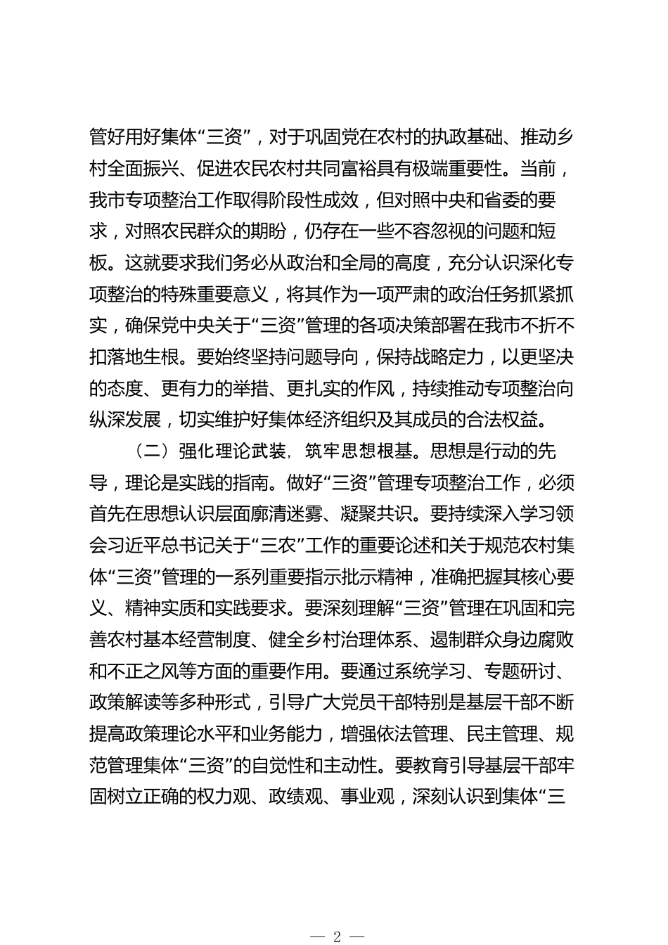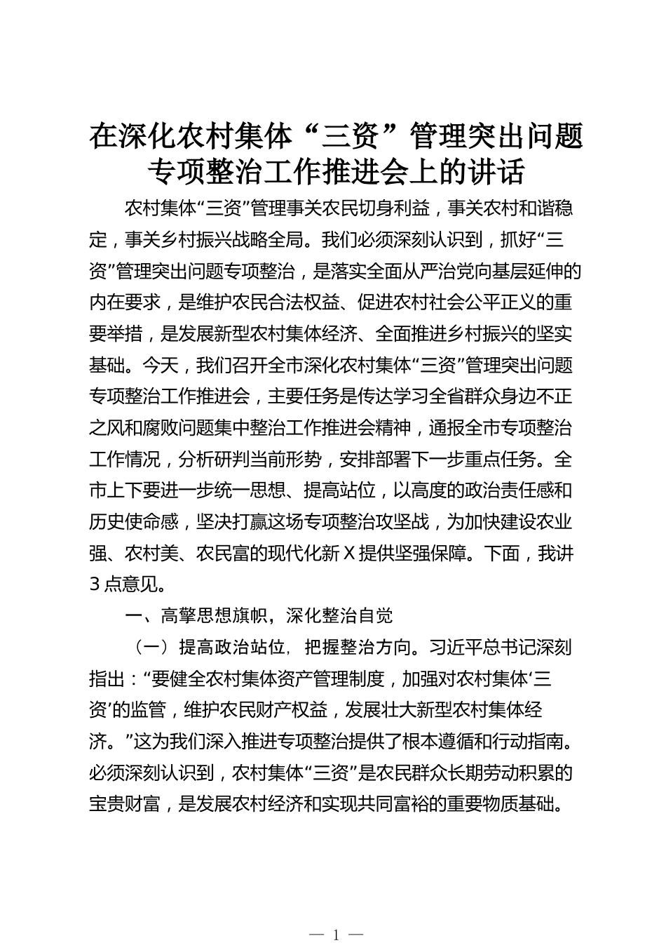 在深化農(nóng)村集體“三資”管理突出問題專項(xiàng)整治工作推進(jìn)會(huì)上的講話“”農(nóng)村集體三資管理事關(guān)農(nóng)民切身利益,事關(guān)農(nóng)村和諧穩(wěn)“定,事關(guān)鄉(xiāng)村振興戰(zhàn)略全局。我們必須深刻認(rèn)識(shí)到,抓好三”資管理突出問題專項(xiàng)整治,是落實(shí)全面從嚴(yán)治黨向基層延伸的內(nèi)在要求,是維護(hù)農(nóng)民合法權(quán)益、促進(jìn)農(nóng)村社會(huì)公平正義的重要舉措,是發(fā)展新型農(nóng)村集體經(jīng)濟(jì)、全面推進(jìn)鄉(xiāng)村振興的堅(jiān)實(shí)“”基礎(chǔ)。今天,我們召開全市深化農(nóng)村集體三資管理突出問題專項(xiàng)整治工作推進(jìn)會(huì),主要任務(wù)是傳達(dá)學(xué)習(xí)全省群眾身邊不正之風(fēng)和腐敗問題集中整治工作推進(jìn)會(huì)精神,通報(bào)全市專項(xiàng)整治工作情況,分析研判當(dāng)前形勢(shì),安排部署...