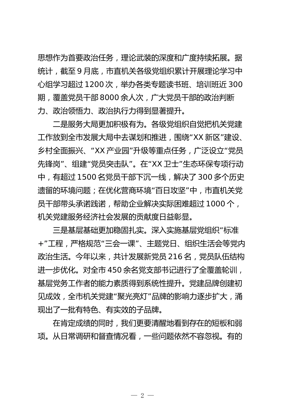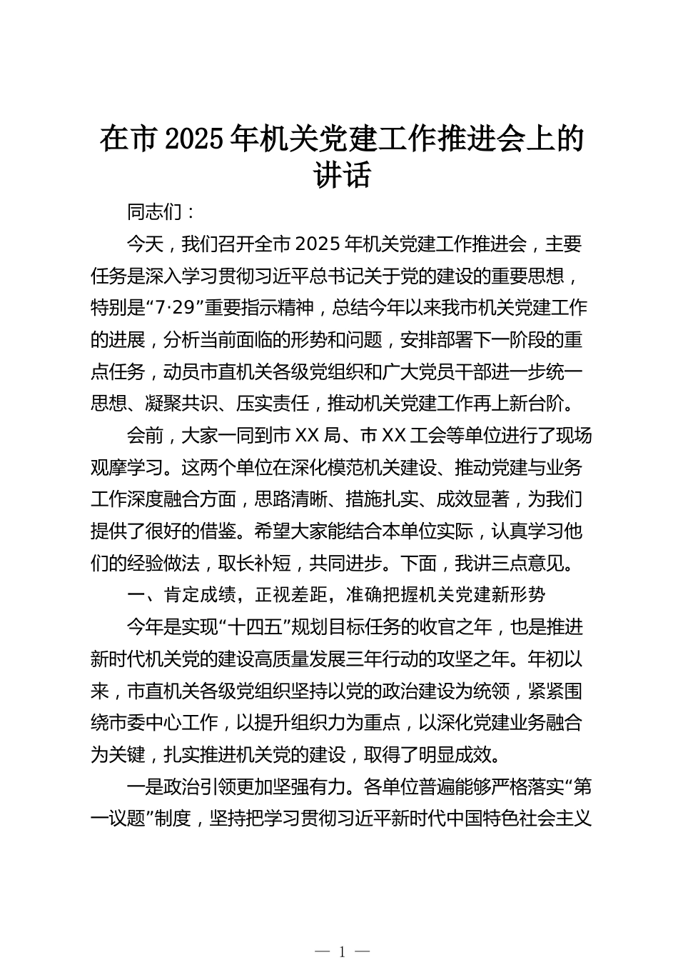 在市2025年機(jī)關(guān)黨建工作推進(jìn)會上的講話同志們:今天,我們召開全市2025年機(jī)關(guān)黨建工作推進(jìn)會,主要任務(wù)是深入學(xué)習(xí)貫徹習(xí)近平總書記關(guān)于黨的建設(shè)的重要思想,“特別是7·29”重要指示精神,總結(jié)今年以來我市機(jī)關(guān)黨建工作的進(jìn)展,分析當(dāng)前面臨的形勢和問題,安排部署下一階段的重點(diǎn)任務(wù),動(dòng)員市直機(jī)關(guān)各級黨組織和廣大黨員干部進(jìn)一步統(tǒng)一思想、凝聚共識、壓實(shí)責(zé)任,推動(dòng)機(jī)關(guān)黨建工作再上新臺階。會前,大家一同到市XX局、市XX工會等單位進(jìn)行了現(xiàn)場觀摩學(xué)習(xí)。這兩個(gè)單位在深化模范機(jī)關(guān)建設(shè)、推動(dòng)黨建與業(yè)務(wù)工作深度融合方面,思路清晰、措施扎實(shí)、成效顯著,為我們提供了很...