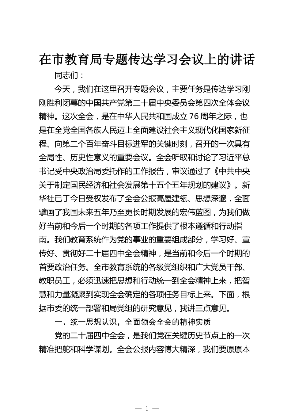 在市教育局專題傳達學(xué)習(xí)會議上的講話同志們:今天,我們在這里召開專題會議,主要任務(wù)是傳達學(xué)習(xí)剛剛勝利閉幕的中國共產(chǎn)黨第二十屆中央委員會第四次全體會議精神。這次全會,是在中華人民共和國成立76周年之際,也是在全黨全國各族人民邁上全面建設(shè)社會主義現(xiàn)代化國家新征程、向第二個百年奮斗目標進軍的關(guān)鍵時刻,召開的一次具有全局性、歷史性意義的重要會議。全會聽取和討論了習(xí)近平總書記受中央政治局委托作的工作報告,審議通過了《中共中央關(guān)于制定國民經(jīng)濟和社會發(fā)展第十五個五年規(guī)劃的建議》。新華社已于今日受權(quán)發(fā)布了全會公報高屋建瓴、思想深邃,全面擘畫了我...