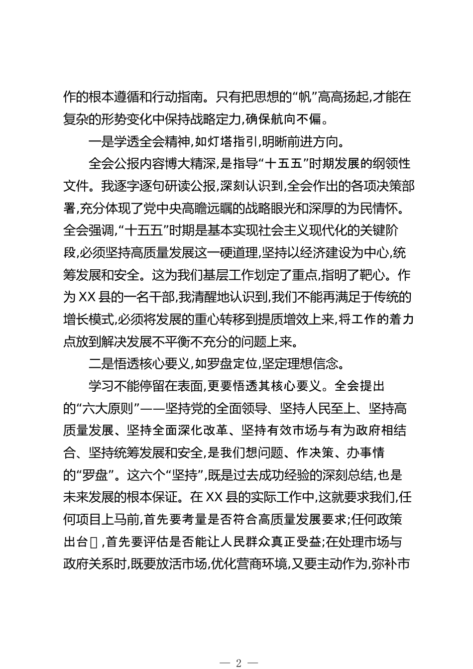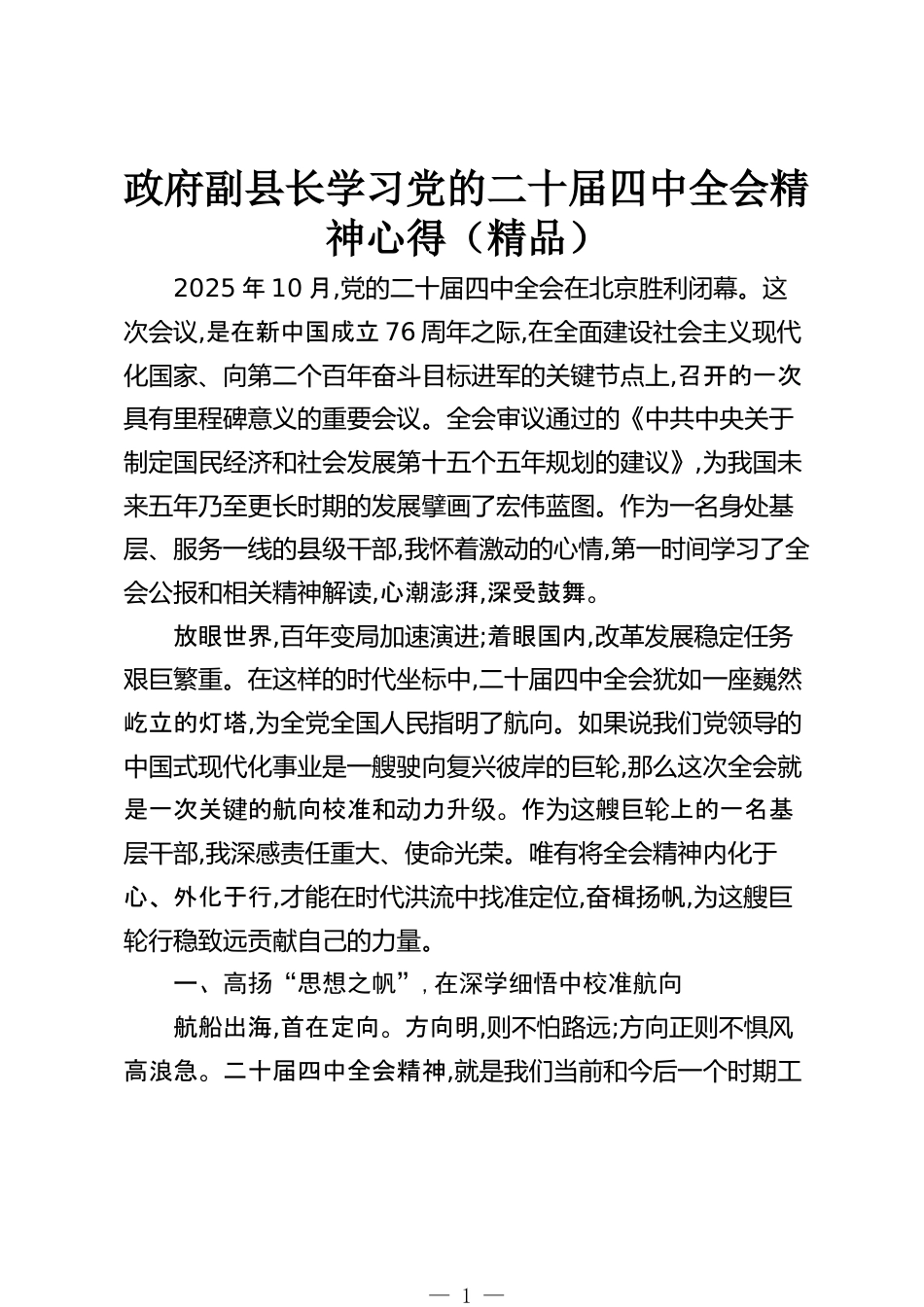 政府副縣長學習黨的二十屆四中全會精神心得(精品)2025年10月,黨的二十屆四中全會在北京勝利閉幕。這次會議,是在新中國成立76周年之際,在全面建設社會主義現(xiàn)代化國家、向第二個百年奮斗目標進軍的關(guān)鍵節(jié)點上,召開的一次具有里程碑意義的重要會議。全會審議通過的《中共中央關(guān)于制定國民經(jīng)濟和社會發(fā)展第十五個五年規(guī)劃的建議》,為我國未來五年乃至更長時期的發(fā)展擘畫了宏偉藍圖。作為一名身處基層、服務一線的縣級干部,我懷著激動的心情,第一時間學習了全會公報和相關(guān)精神解讀,心潮澎湃,深受鼓舞。放眼世界,百年變局加速演進;著眼國內(nèi),改革發(fā)展穩(wěn)定任務艱巨繁重。在這樣...