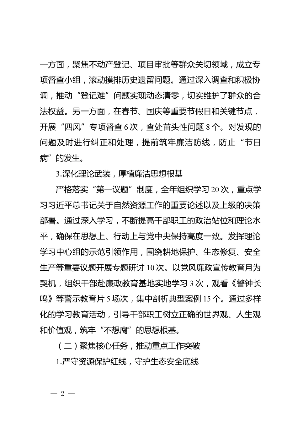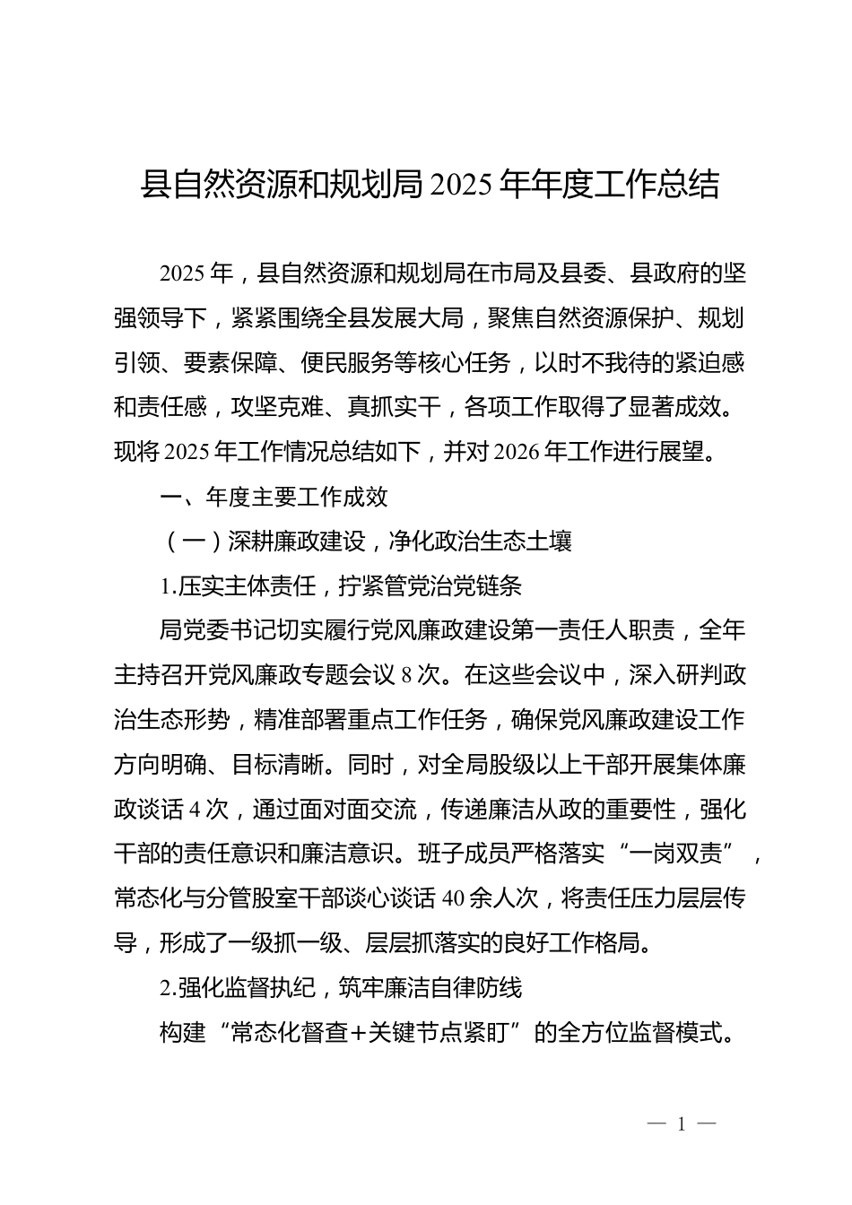 縣自然資源和規(guī)劃局2025年年度工作總結(jié)2025年,縣自然資源和規(guī)劃局在市局及縣委、縣政府的堅(jiān)強(qiáng)領(lǐng)導(dǎo)下,緊緊圍繞全縣發(fā)展大局,聚焦自然資源保護(hù)、規(guī)劃引領(lǐng)、要素保障、便民服務(wù)等核心任務(wù),以時(shí)不我待的緊迫感和責(zé)任感,攻堅(jiān)克難、真抓實(shí)干,各項(xiàng)工作取得了顯著成效。現(xiàn)將2025年工作情況總結(jié)如下,并對2026年工作進(jìn)行展望。一、年度主要工作成效(一)深耕廉政建設(shè),凈化政治生態(tài)土壤1.壓實(shí)主體責(zé)任,擰緊管黨治黨鏈條局黨委書記切實(shí)履行黨風(fēng)廉政建設(shè)第一責(zé)任人職責(zé),全年主持召開黨風(fēng)廉政專題會(huì)議8次。在這些會(huì)議中,深入研判政治生態(tài)形勢,精準(zhǔn)部署重點(diǎn)工作任務(wù),確保...