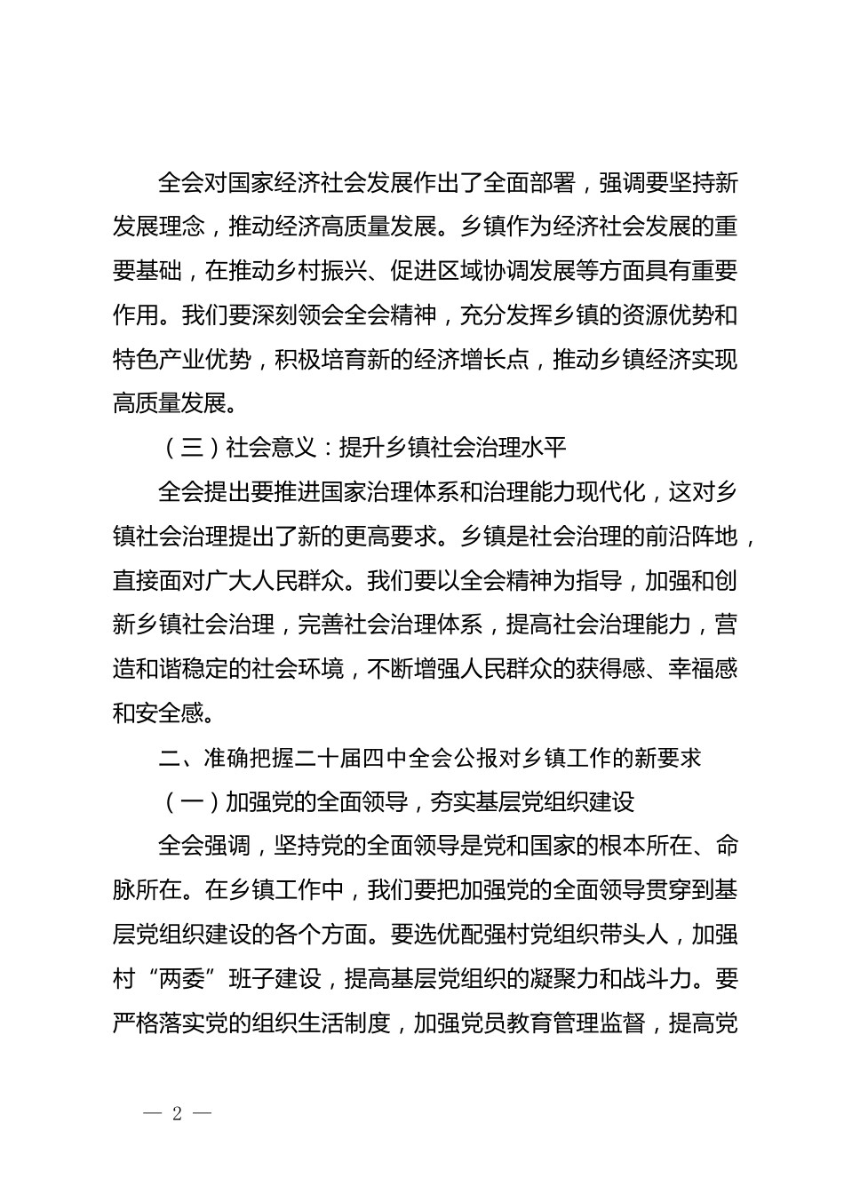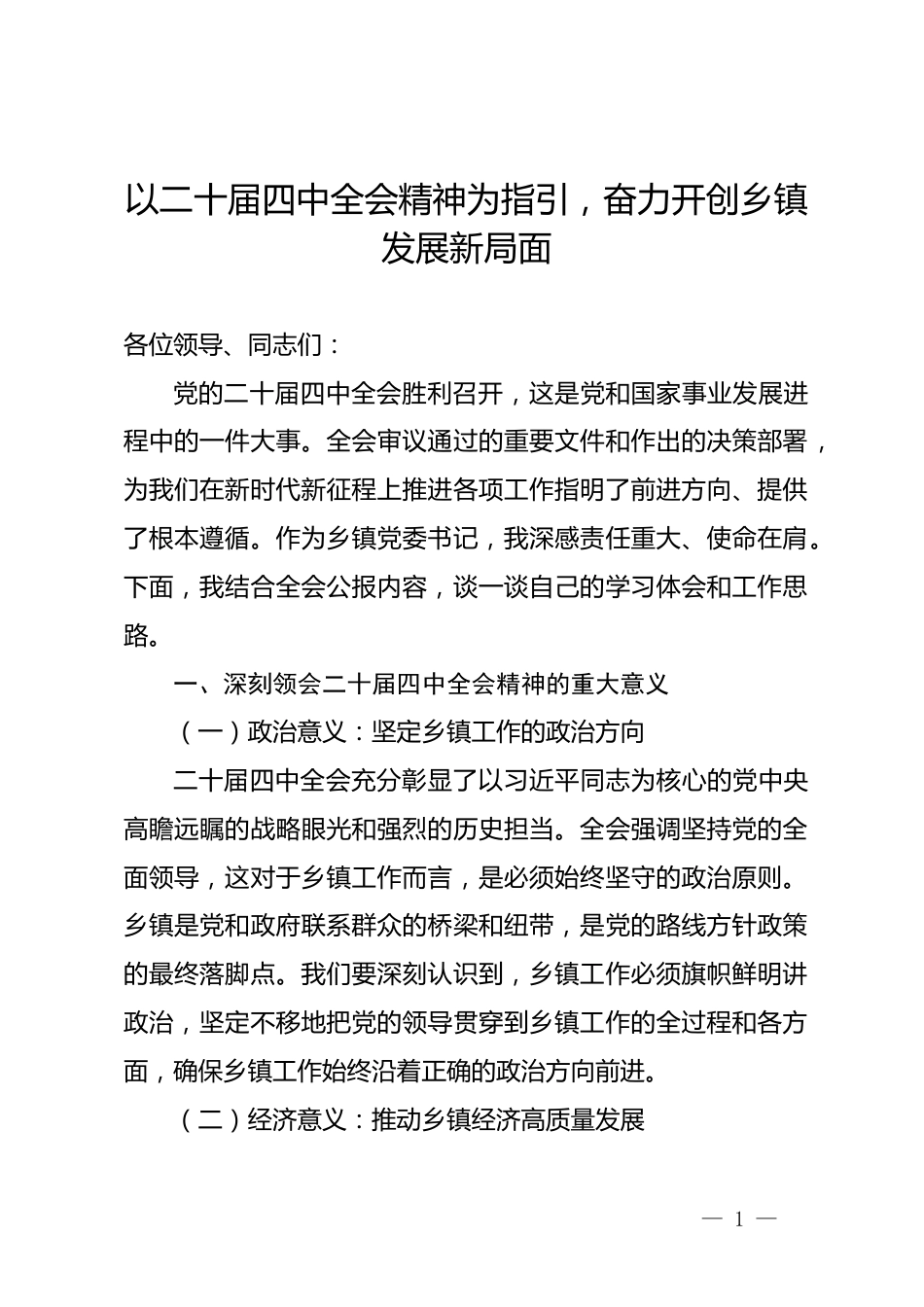 以二十屆四中全會精神為指引,奮力開創(chuàng)鄉(xiāng)鎮(zhèn)發(fā)展新局面各位領導、同志們:黨的二十屆四中全會勝利召開,這是黨和國家事業(yè)發(fā)展進程中的一件大事。全會審議通過的重要文件和作出的決策部署,為我們在新時代新征程上推進各項工作指明了前進方向、提供了根本遵循。作為鄉(xiāng)鎮(zhèn)黨委書記,我深感責任重大、使命在肩。下面,我結合全會公報內(nèi)容,談一談自己的學習體會和工作思路。一、深刻領會二十屆四中全會精神的重大意義(一)政治意義:堅定鄉(xiāng)鎮(zhèn)工作的政治方向二十屆四中全會充分彰顯了以習近平同志為核心的黨中央高瞻遠矚的戰(zhàn)略眼光和強烈的歷史擔當。全會強調堅持黨的全面領導...