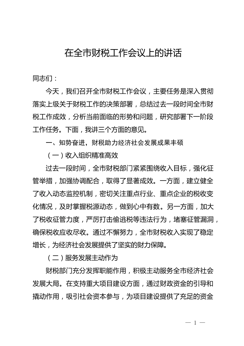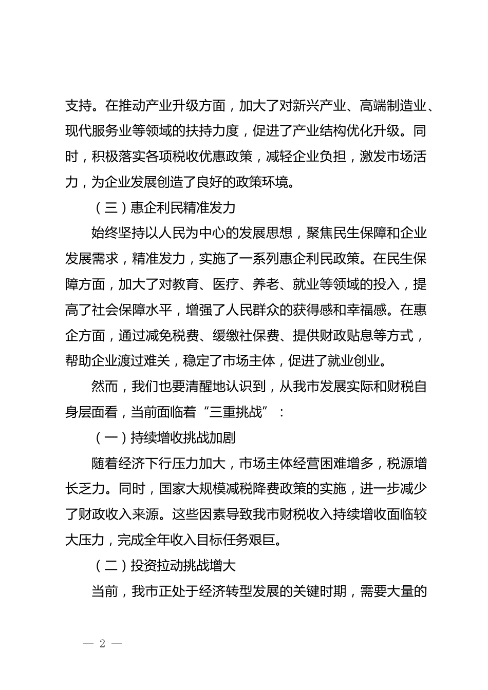 在全市財(cái)稅工作會(huì)議上的講話同志們:今天,我們召開全市財(cái)稅工作會(huì)議,主要任務(wù)是深入貫徹落實(shí)上級(jí)關(guān)于財(cái)稅工作的決策部署,總結(jié)過去一段時(shí)間全市財(cái)稅工作成效,分析當(dāng)前面臨的形勢(shì)和問題,研究部署下一階段工作任務(wù)。下面,我講三個(gè)方面的意見。一、知?jiǎng)輮^進(jìn),財(cái)稅助力經(jīng)濟(jì)社會(huì)發(fā)展成果豐碩(一)收入組織精準(zhǔn)高效過去一段時(shí)間,全市財(cái)稅部門緊緊圍繞收入目標(biāo),強(qiáng)化征管舉措,加強(qiáng)協(xié)調(diào)配合,取得了顯著成效。一方面,建立健全了收入動(dòng)態(tài)監(jiān)控機(jī)制,密切關(guān)注重點(diǎn)行業(yè)、重點(diǎn)企業(yè)的稅收變化情況,及時(shí)掌握稅源動(dòng)態(tài),做到心中有數(shù)。另一方面,加大了稅收征管力度,嚴(yán)厲打擊偷...