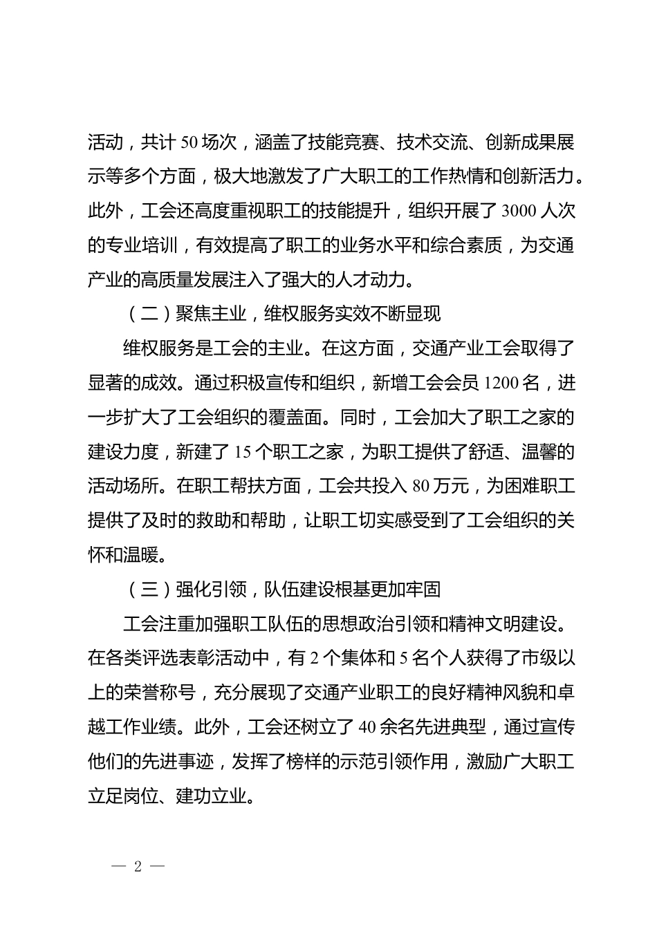 在市交通產(chǎn)業(yè)工會座談會上的講話同志們:今天,我們齊聚一堂,召開市交通產(chǎn)業(yè)工會座談會。本次會議的目的十分明確,一是對過去一段時(shí)間交通產(chǎn)業(yè)工會的工作進(jìn)行全面回顧總結(jié),梳理工作中的經(jīng)驗(yàn)與成果;二是深入分析當(dāng)前交通產(chǎn)業(yè)工會工作面臨的形勢,精準(zhǔn)把握時(shí)代發(fā)展的脈搏;三是研究并部署下一階段的工作任務(wù),為推動(dòng)交通產(chǎn)業(yè)工會工作再上新臺階指明方向。剛才,8家單位工會主席進(jìn)行了精彩的發(fā)言,全面總結(jié)了各自單位工會工作的開展情況,內(nèi)容豐富、特色鮮明、成效顯著。在此,我謹(jǐn)代表局黨組,向長期以來奮戰(zhàn)在交通產(chǎn)業(yè)工會工作一線的廣大職工表示衷心的感謝和崇高的敬...