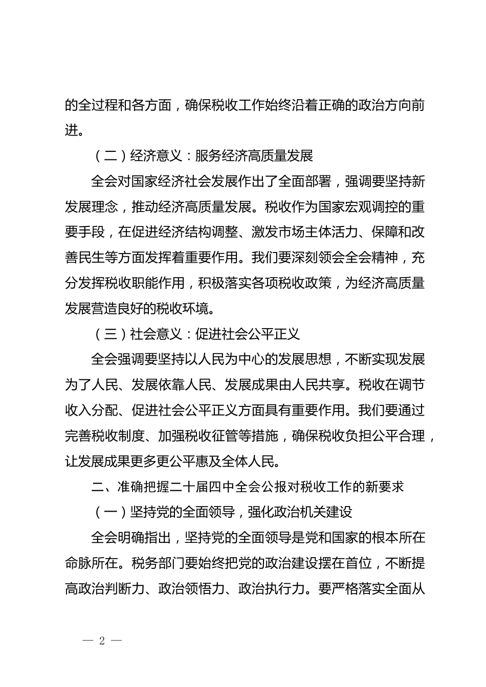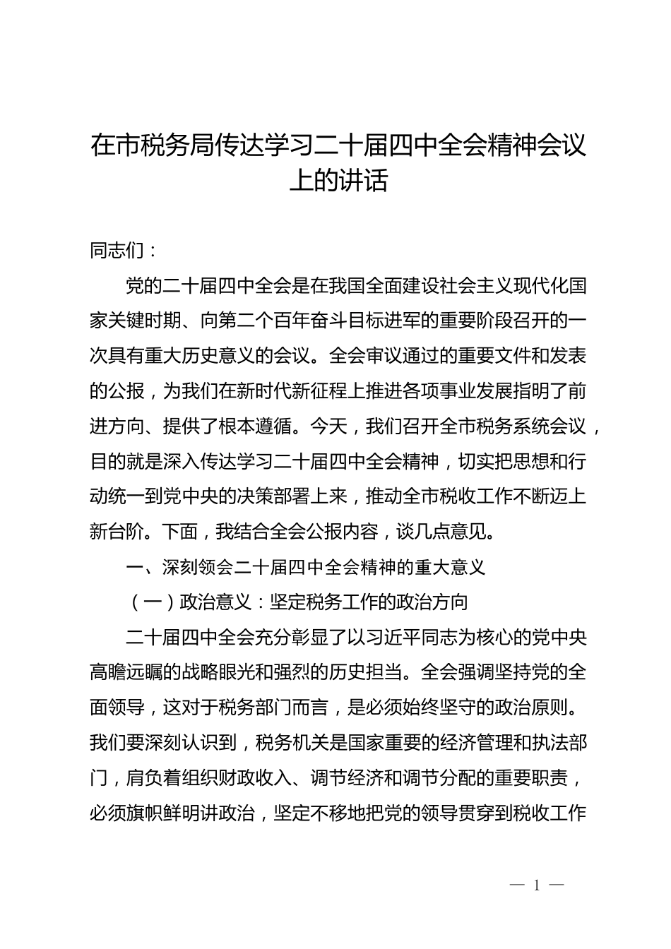 在市稅務(wù)局傳達(dá)學(xué)習(xí)二十屆四中全會(huì)精神會(huì)議上的講話同志們:黨的二十屆四中全會(huì)是在我國全面建設(shè)社會(huì)主義現(xiàn)代化國家關(guān)鍵時(shí)期、向第二個(gè)百年奮斗目標(biāo)進(jìn)軍的重要階段召開的一次具有重大歷史意義的會(huì)議。全會(huì)審議通過的重要文件和發(fā)表的公報(bào),為我們在新時(shí)代新征程上推進(jìn)各項(xiàng)事業(yè)發(fā)展指明了前進(jìn)方向、提供了根本遵循。今天,我們召開全市稅務(wù)系統(tǒng)會(huì)議,目的就是深入傳達(dá)學(xué)習(xí)二十屆四中全會(huì)精神,切實(shí)把思想和行動(dòng)統(tǒng)一到黨中央的決策部署上來,推動(dòng)全市稅收工作不斷邁上新臺(tái)階。下面,我結(jié)合全會(huì)公報(bào)內(nèi)容,談幾點(diǎn)意見。一、深刻領(lǐng)會(huì)二十屆四中全會(huì)精神的重大意義(一)政治意...