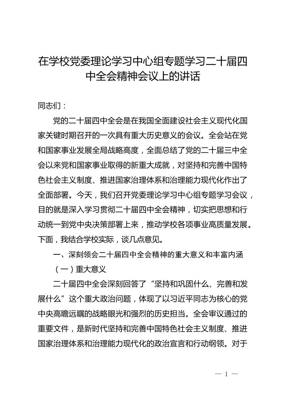 在學(xué)校黨委理論學(xué)習(xí)中心組專(zhuān)題學(xué)習(xí)二十屆四中全會(huì)精神會(huì)議上的講話(huà)同志們:黨的二十屆四中全會(huì)是在我國(guó)全面建設(shè)社會(huì)主義現(xiàn)代化國(guó)家關(guān)鍵時(shí)期召開(kāi)的一次具有重大歷史意義的會(huì)議。全會(huì)站在黨和國(guó)家事業(yè)發(fā)展全局戰(zhàn)略高度,全面總結(jié)了黨的二十屆三中全會(huì)以來(lái)黨和國(guó)家事業(yè)取得的新重大成就,對(duì)堅(jiān)持和完善中國(guó)特色社會(huì)主義制度、推進(jìn)國(guó)家治理體系和治理能力現(xiàn)代化作出了全面部署。今天,我們召開(kāi)黨委理論學(xué)習(xí)中心組專(zhuān)題學(xué)習(xí)會(huì)議,目的就是深入學(xué)習(xí)貫徹二十屆四中全會(huì)精神,切實(shí)把思想和行動(dòng)統(tǒng)一到黨中央決策部署上來(lái),推動(dòng)學(xué)校各項(xiàng)事業(yè)高質(zhì)量發(fā)展。下面,我結(jié)合學(xué)校實(shí)際,談幾點(diǎn)...