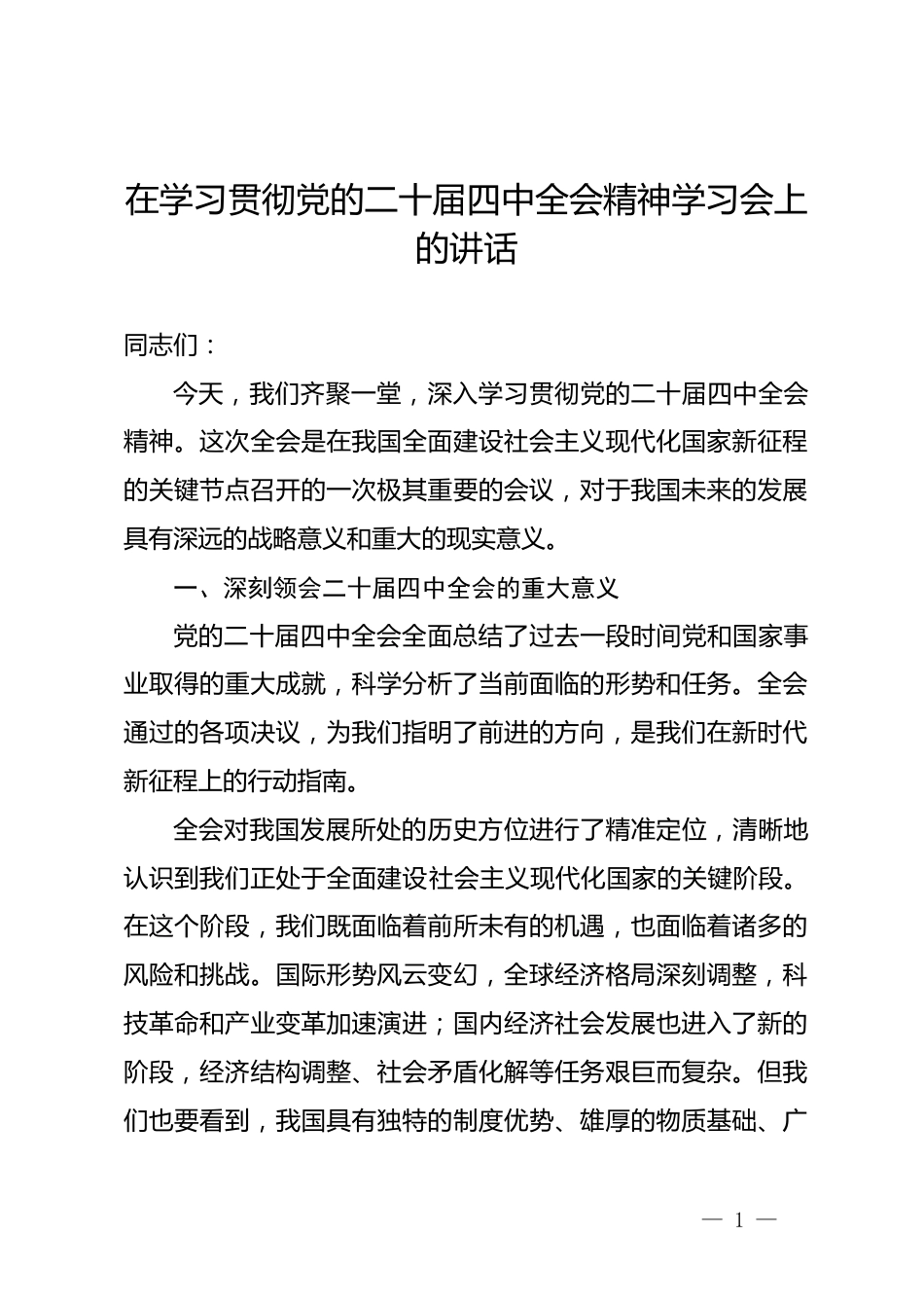 在學(xué)習(xí)貫徹黨的二十屆四中全會(huì)精神學(xué)習(xí)會(huì)上的講話同志們:今天,我們齊聚一堂,深入學(xué)習(xí)貫徹黨的二十屆四中全會(huì)精神。這次全會(huì)是在我國(guó)全面建設(shè)社會(huì)主義現(xiàn)代化國(guó)家新征程的關(guān)鍵節(jié)點(diǎn)召開(kāi)的一次極其重要的會(huì)議,對(duì)于我國(guó)未來(lái)的發(fā)展具有深遠(yuǎn)的戰(zhàn)略意義和重大的現(xiàn)實(shí)意義。一、深刻領(lǐng)會(huì)二十屆四中全會(huì)的重大意義黨的二十屆四中全會(huì)全面總結(jié)了過(guò)去一段時(shí)間黨和國(guó)家事業(yè)取得的重大成就,科學(xué)分析了當(dāng)前面臨的形勢(shì)和任務(wù)。全會(huì)通過(guò)的各項(xiàng)決議,為我們指明了前進(jìn)的方向,是我們?cè)谛聲r(shí)代新征程上的行動(dòng)指南。全會(huì)對(duì)我國(guó)發(fā)展所處的歷史方位進(jìn)行了精準(zhǔn)定位,清晰地認(rèn)識(shí)到我們正處于全...