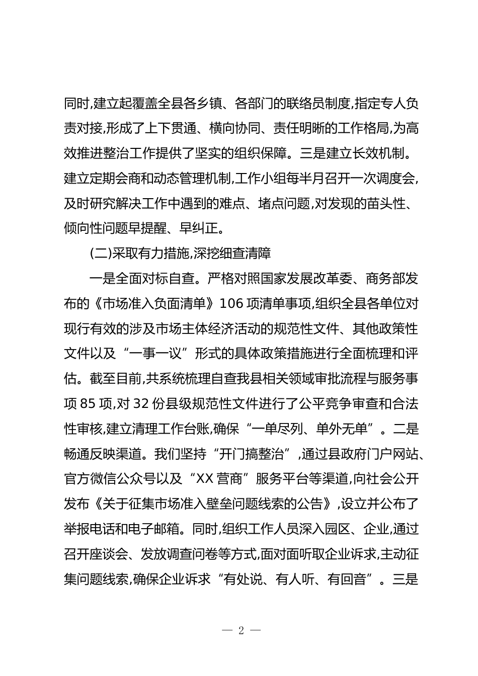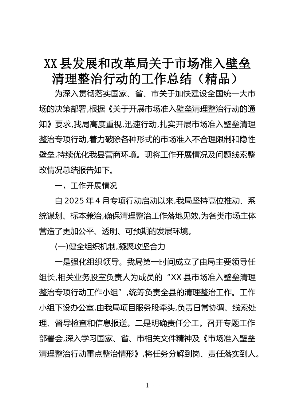 XX縣發(fā)展和改革局關于市場準入壁壘清理整治行動的工作總結(精品)為深入貫徹落實國家、省、市關于加快建設全國統(tǒng)一大市場的決策部署,根據《關于開展市場準入壁壘清理整治行動的通知》要求,我局高度重視,迅速行動,扎實開展市場準入壁壘清理整治專項行動,著力破除各種形式的市場準入不合理限制和隱性壁壘,持續(xù)優(yōu)化我縣營商環(huán)境?,F將工作開展情況及問題線索整改情況總結報告如下。一、工作開展情況自2025年4月專項行動啟動以來,我局堅持高位推動、系統(tǒng)謀劃、標本兼治,確保清理整治工作落地見效,為各類市場主體營造了更加公平、透明、可預期的發(fā)展環(huán)境。(一)健全組織機制,...