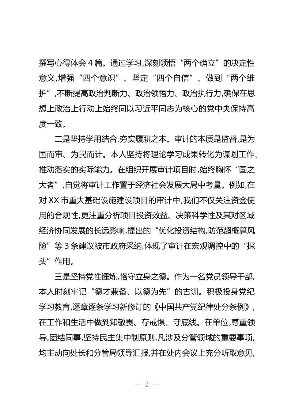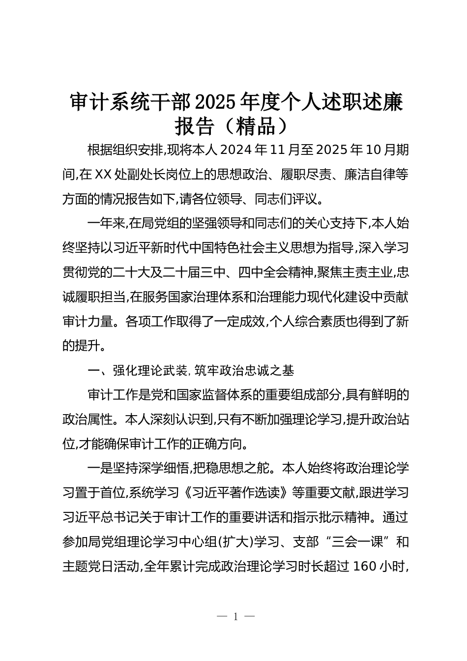 審計系統(tǒng)干部2025年度個人述職述廉報告(精品)根據組織安排,現(xiàn)將本人2024年11月至2025年10月期間,在XX處副處長崗位上的思想政治、履職盡責、廉潔自律等方面的情況報告如下,請各位領導、同志們評議。一年來,在局黨組的堅強領導和同志們的關心支持下,本人始終堅持以習近平新時代中國特色社會主義思想為指導,深入學習貫徹黨的二十大及二十屆三中、四中全會精神,聚焦主責主業(yè),忠誠履職擔當,在服務國家治理體系和治理能力現(xiàn)代化建設中貢獻審計力量。各項工作取得了一定成效,個人綜合素質也得到了新的提升。一、強化理論武裝,筑牢政治忠誠之基審計工作是黨和國家監(jiān)督體系的重...