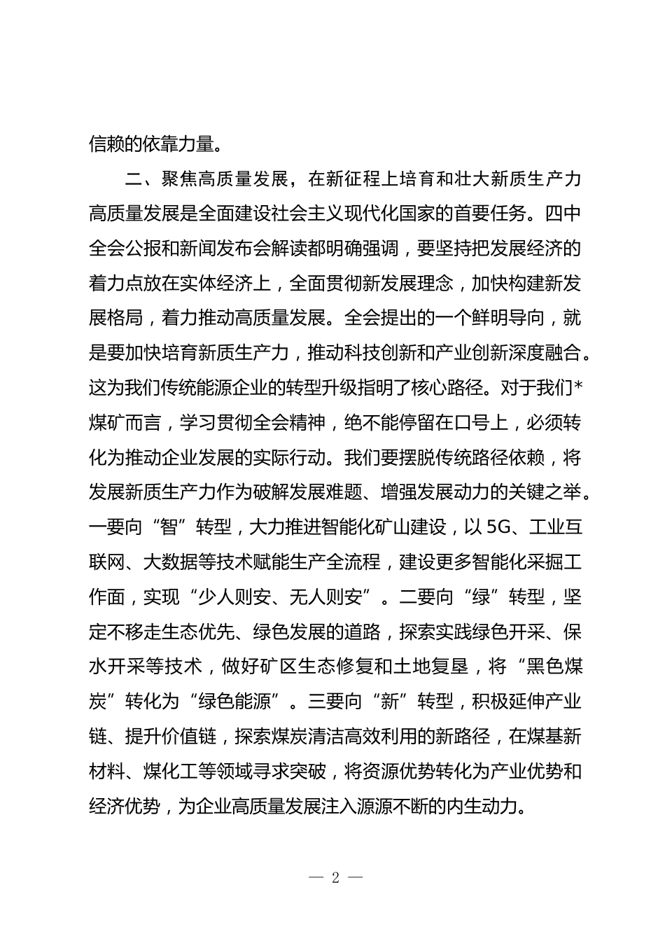 心得體會(huì):以更加昂揚(yáng)的斗志、更加扎實(shí)的作風(fēng)譜寫(xiě)企業(yè)高質(zhì)量發(fā)展新篇章結(jié)合本次學(xué)習(xí)貫徹全會(huì)精神,我將個(gè)人的思考與體會(huì)匯報(bào)如下。一、筑牢政治忠誠(chéng),在擘畫(huà)“十五五”宏偉藍(lán)圖中堅(jiān)定航向。黨的二十屆四中全會(huì)是在我國(guó)開(kāi)啟“十五五”新征程、向基本實(shí)現(xiàn)社會(huì)主義現(xiàn)代化目標(biāo)邁進(jìn)的關(guān)鍵節(jié)點(diǎn)上召開(kāi)的一次具有全局性、歷史性意義的重要會(huì)議。全會(huì)公報(bào)指出,“十五五”時(shí)期是基本實(shí)現(xiàn)社會(huì)主義現(xiàn)代化夯實(shí)基礎(chǔ)、全面發(fā)力的關(guān)鍵時(shí)期。作為國(guó)有企業(yè)的黨員領(lǐng)導(dǎo)干部,必須深刻領(lǐng)悟“兩個(gè)確立”的決定性意義,增強(qiáng)“四個(gè)意識(shí)”、堅(jiān)定“四個(gè)自信”、做到“兩個(gè)維護(hù)”,始終在思想上政治...