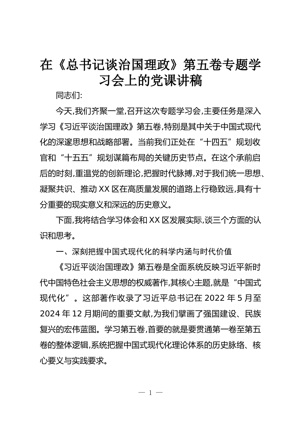 在《總書記談治國理政》第五卷專題學(xué)習(xí)會(huì)上的黨課講稿同志們:今天,我們齊聚一堂,召開這次專題學(xué)習(xí)會(huì),主要任務(wù)是深入學(xué)習(xí)《習(xí)近平談治國理政》第五卷,特別是其中關(guān)于中國式現(xiàn)代化的深邃思想和戰(zhàn)略部署。當(dāng)前我們正處在“十四五”規(guī)劃收官和“十五五”規(guī)劃謀篇布局的關(guān)鍵歷史節(jié)點(diǎn)。在這個(gè)承前啟后的時(shí)刻,重溫黨的創(chuàng)新理論,把握時(shí)代脈搏,對(duì)于我們統(tǒng)一思想、凝聚共識(shí)、推動(dòng)XX區(qū)在高質(zhì)量發(fā)展的道路上行穩(wěn)致遠(yuǎn),具有十分重要的現(xiàn)實(shí)意義和深遠(yuǎn)的歷史意義。下面,我將結(jié)合學(xué)習(xí)體會(huì)和XX區(qū)發(fā)展實(shí)際,談三個(gè)方面的認(rèn)識(shí)和思考。一、深刻把握中國式現(xiàn)代化的科學(xué)內(nèi)涵與時(shí)代價(jià)值《習(xí)近平談...