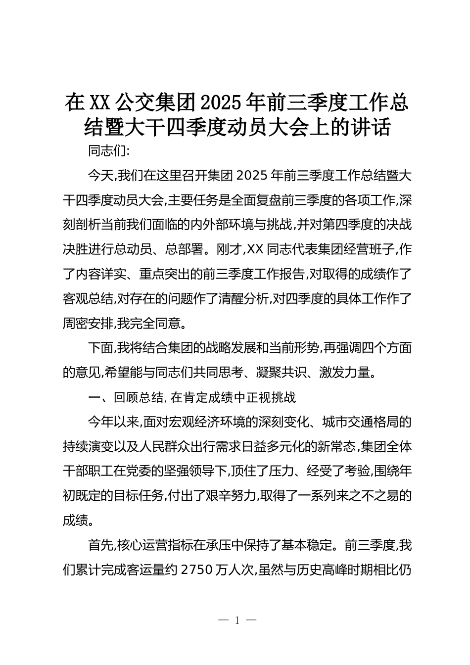 在XX公交集團2025年前三季度工作總結(jié)暨大干四季度動員大會上的講話