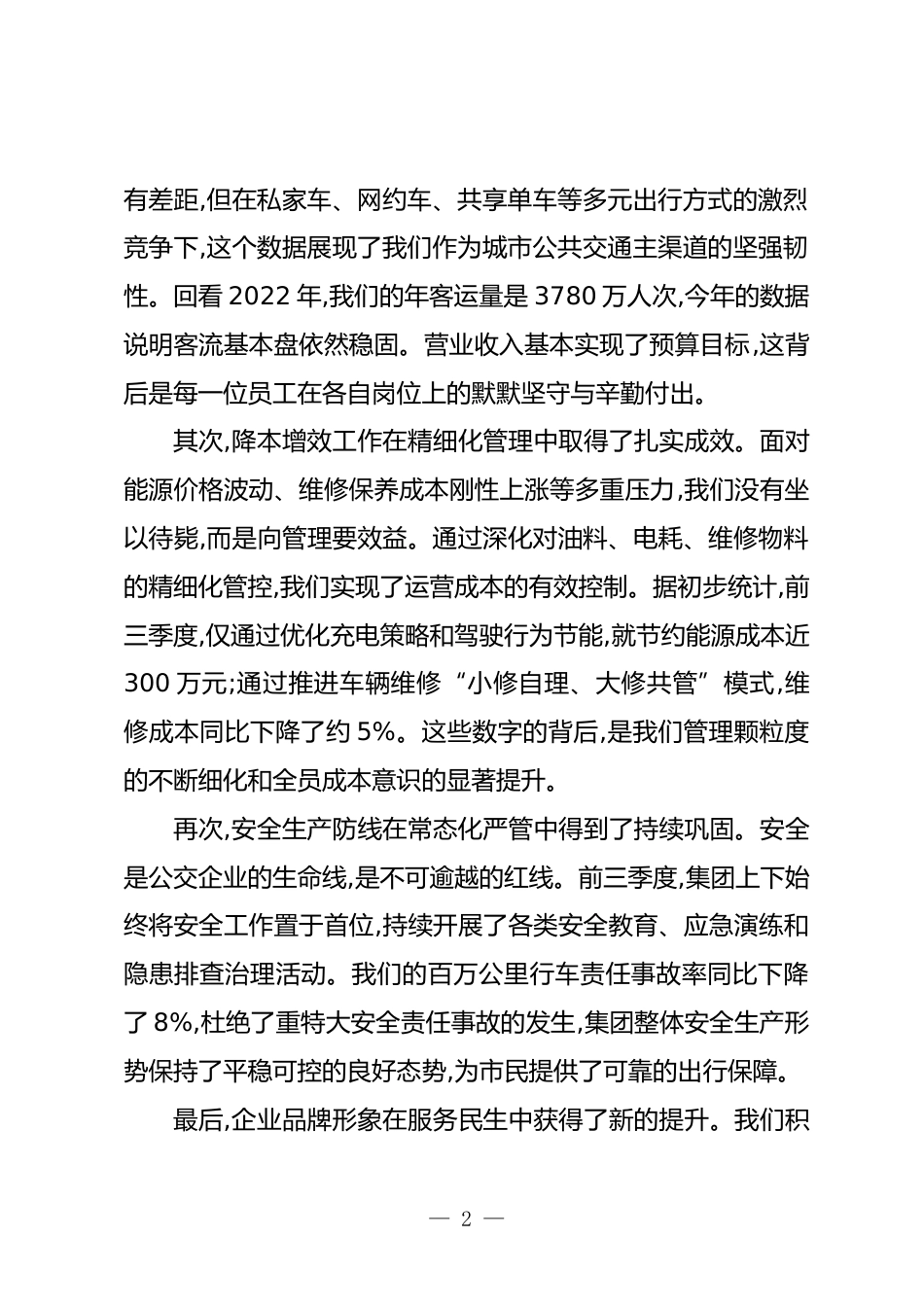 在XX公交集團2025年前三季度工作總結(jié)暨大干四季度動員大會上的講話同志們:今天,我們在這里召開集團2025年前三季度工作總結(jié)暨大干四季度動員大會,主要任務(wù)是全面復(fù)盤前三季度的各項工作,深刻剖析當前我們面臨的內(nèi)外部環(huán)境與挑戰(zhàn),并對第四季度的決戰(zhàn)決勝進行總動員、總部署。剛才,XX同志代表集團經(jīng)營班子,作了內(nèi)容詳實、重點突出的前三季度工作報告,對取得的成績作了客觀總結(jié),對存在的問題作了清醒分析,對四季度的具體工作作了周密安排,我完全同意。下面,我將結(jié)合集團的戰(zhàn)略發(fā)展和當前形勢,再強調(diào)四個方面的意見,希望能與同志們共同思考、凝聚共識、激發(fā)力量。一、回顧總結(jié)...